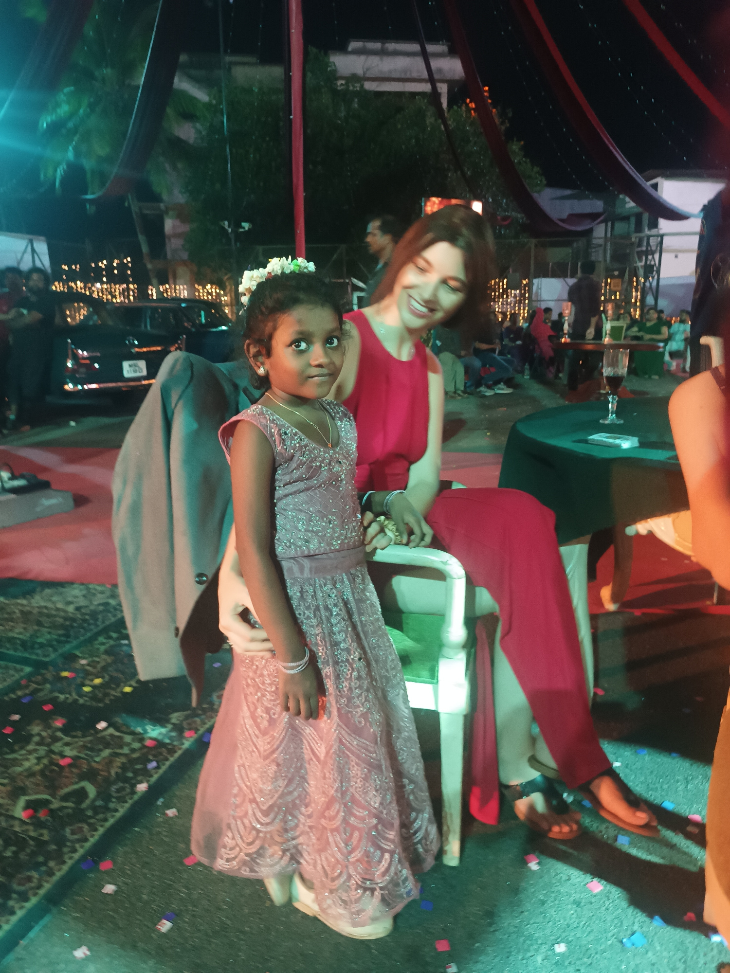 This image captures an outdoor evening or night event in Kalamassery, India, featuring two central figures: a young girl and a woman. In the foreground, a young girl with dark skin and dark, curly ha…read more