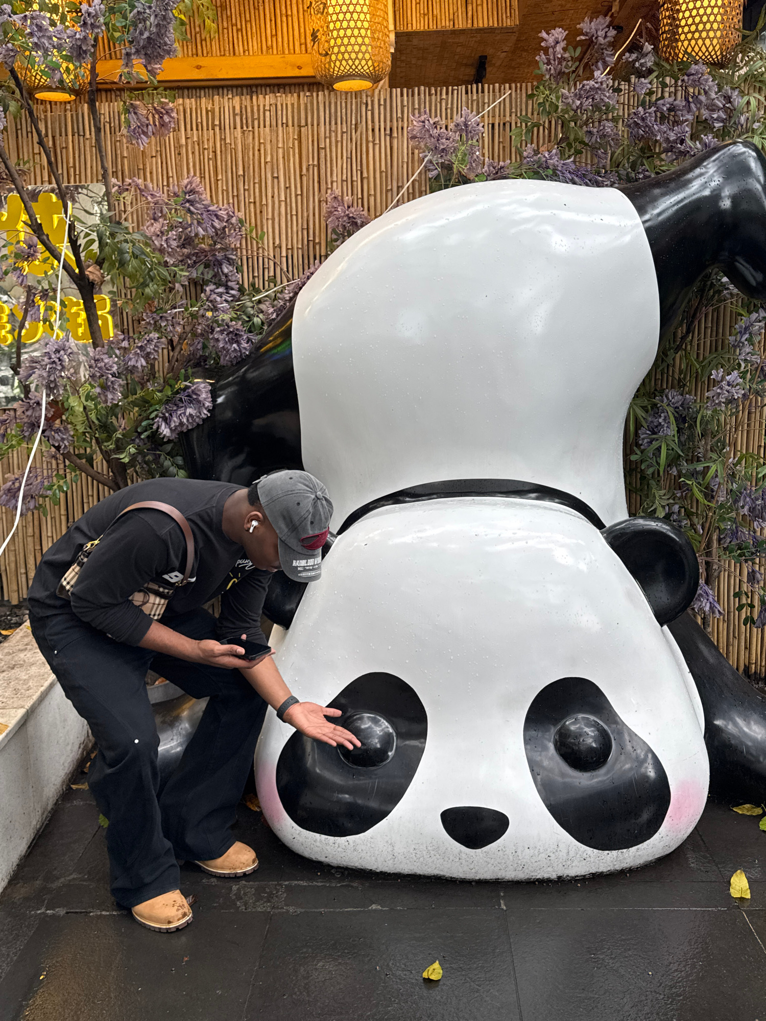 A man sits next to a giant panda statue in what appears to be an outdoor setting. The man is wearing a dark-colored long-sleeved shirt, dark pants, and tan-colored shoes. He has a grey baseball cap onβ¦read more