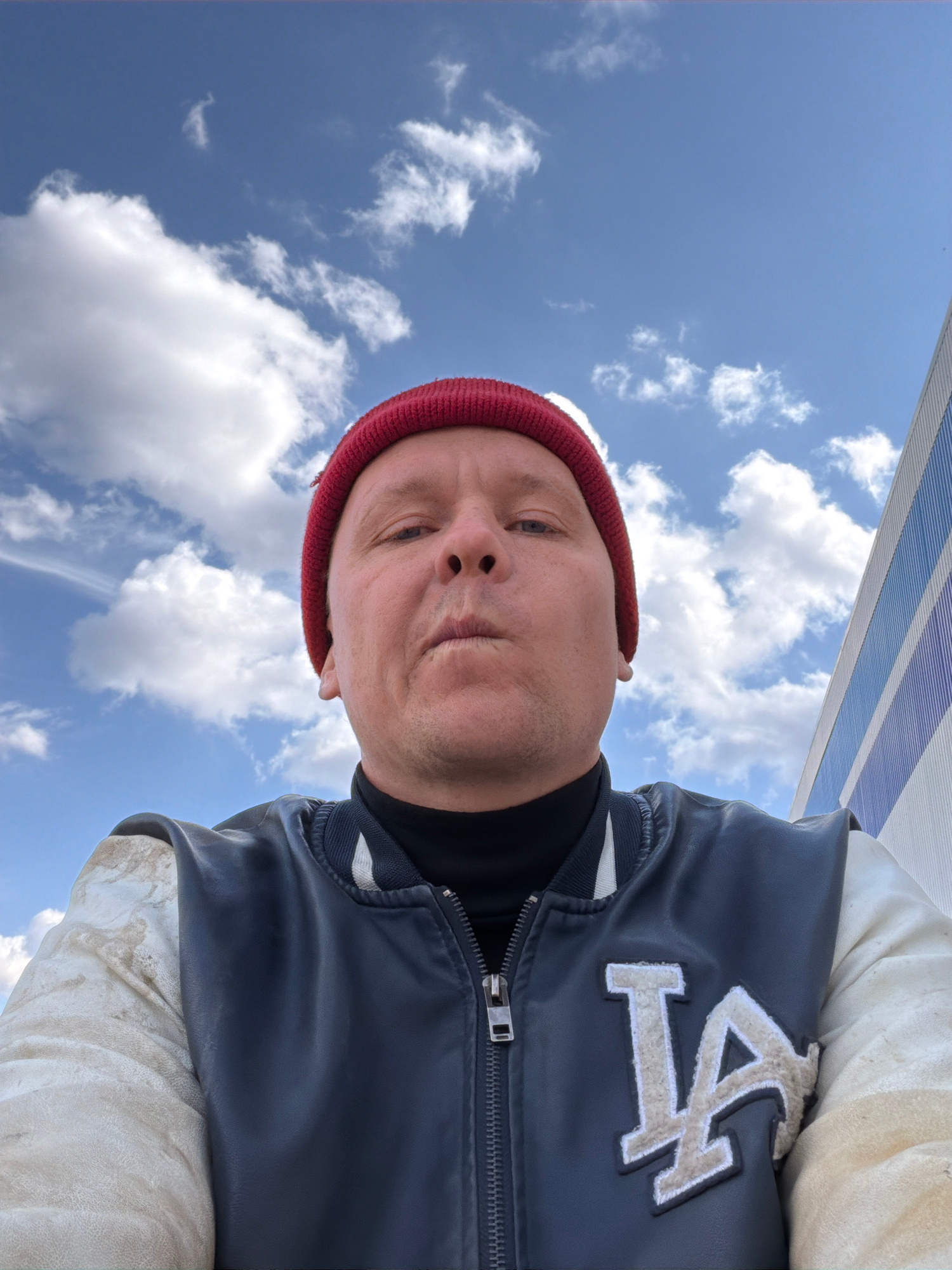 An upward-angled selfie captures a person looking directly at the camera. The individual wears a red knit beanie, a black high-collared shirt, and a dark blue letterman-style jacket with light-colored…read more