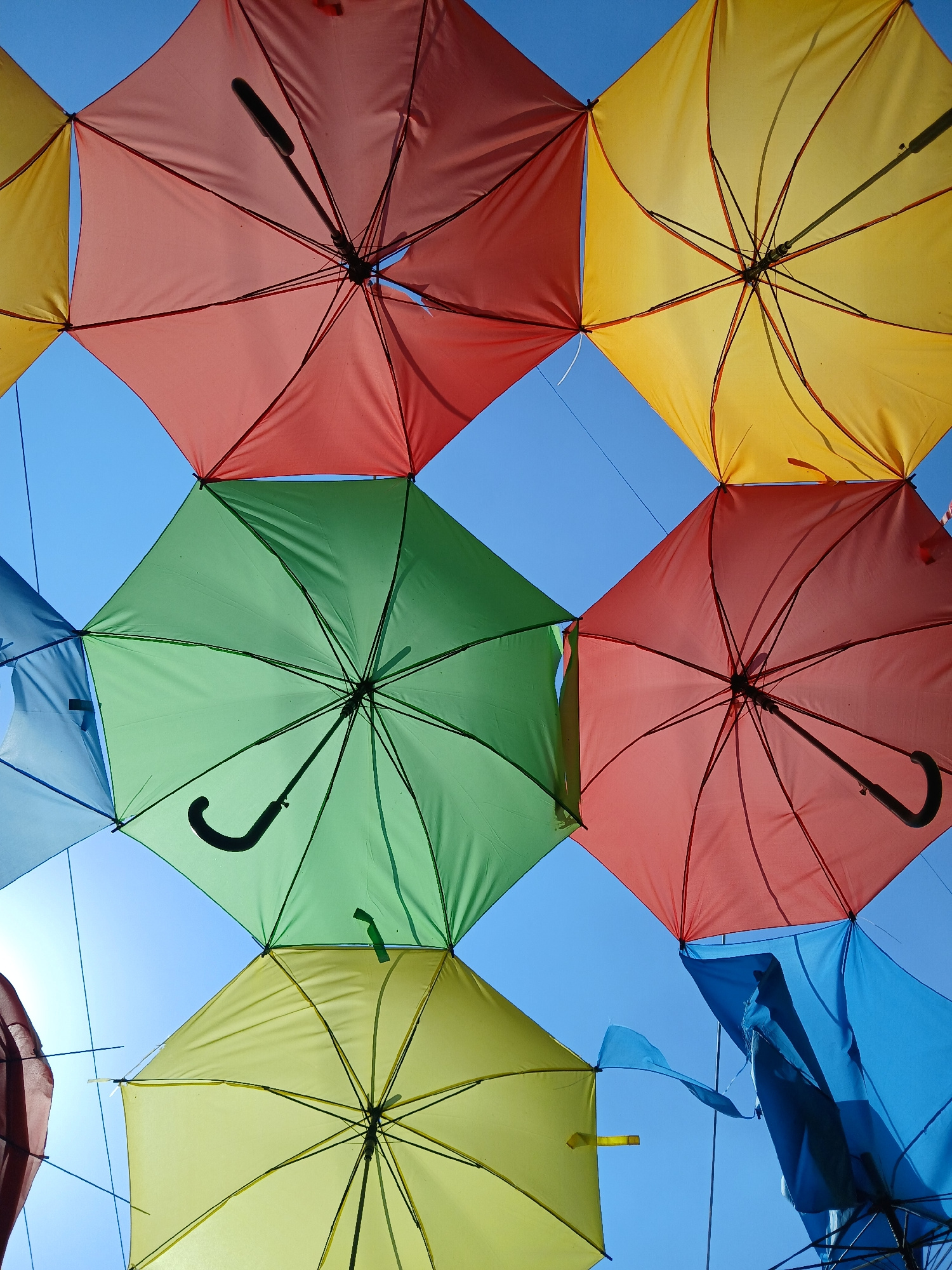 The image shows a view looking up at a display of colorful umbrellas in the city of Ciudad Guayana, Venezuela. The umbrellas are arranged in a grid-like pattern, with the bright blue sky visible in th…read more
