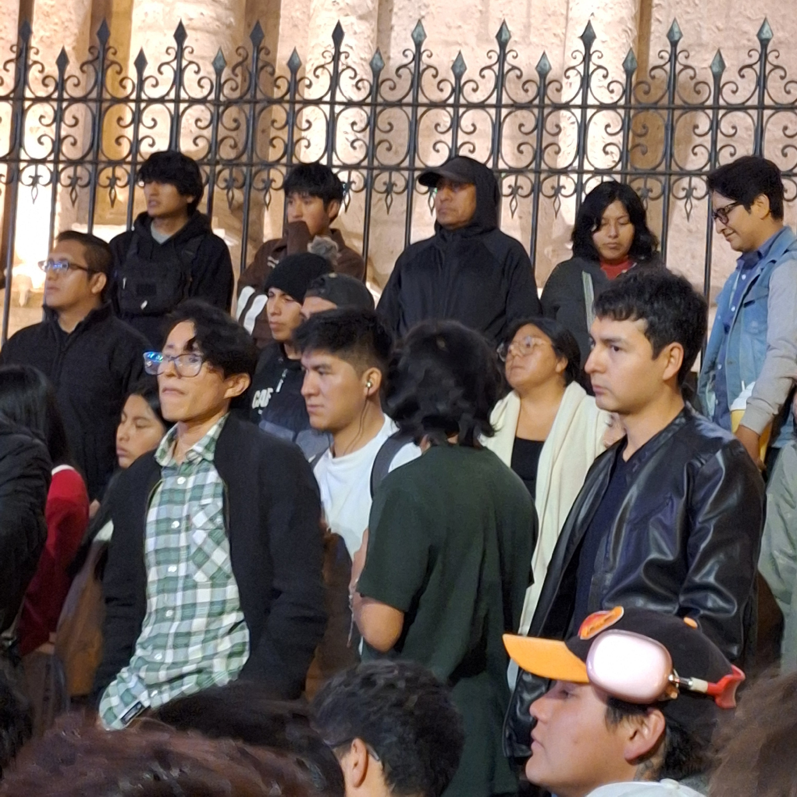 A crowd of people is observed sitting on stone steps, adjacent to a black wrought-iron railing secured against a tan wall, likely in an outdoor setting. The individuals appear to be primarily young ad…read more