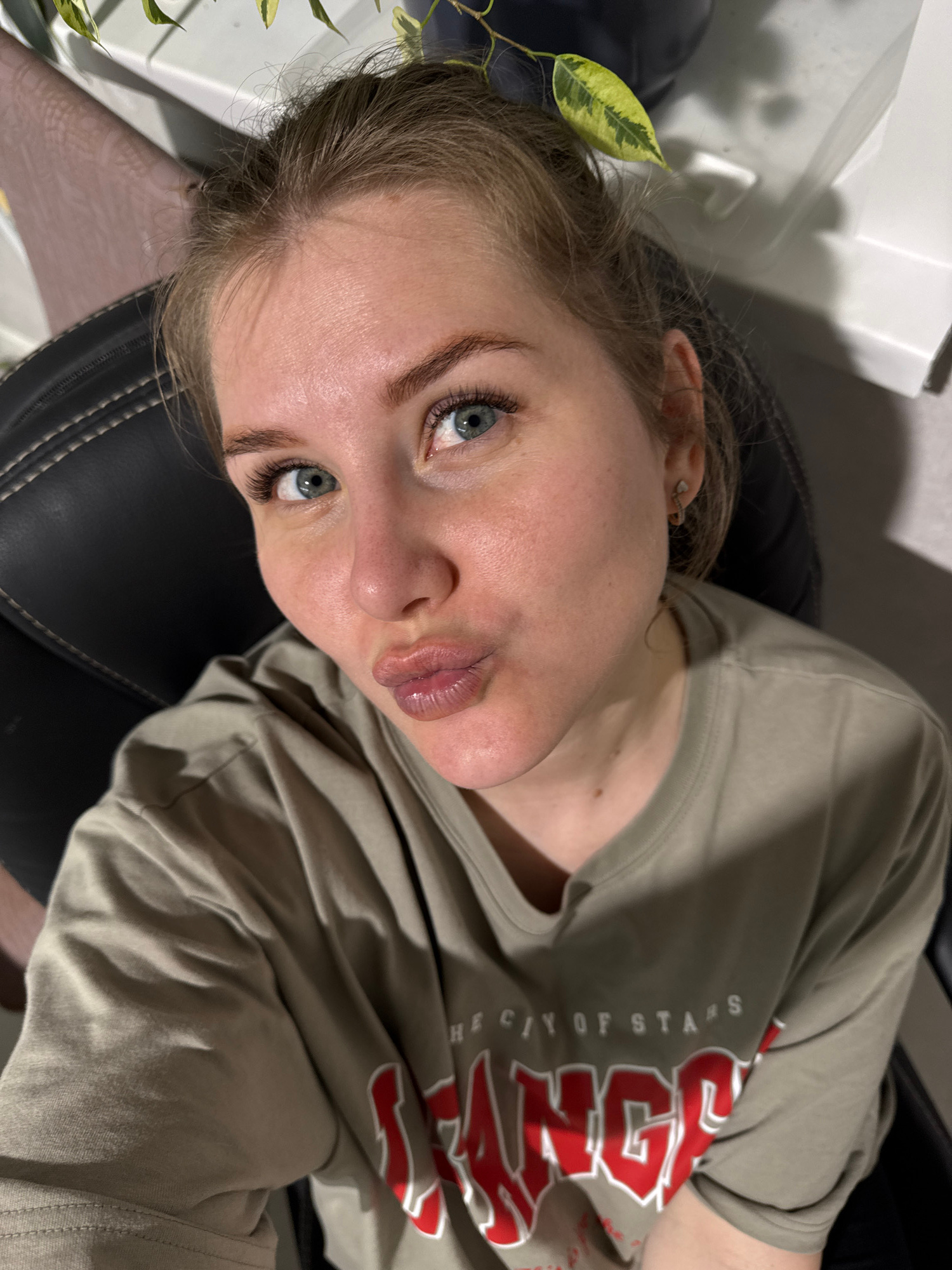 A woman with light skin and blue eyes is lying back in a black chair. She is wearing a light brown t-shirt with the word "Vegas" in red and white, and the phrase "The City of Stars" in white printed o…read more