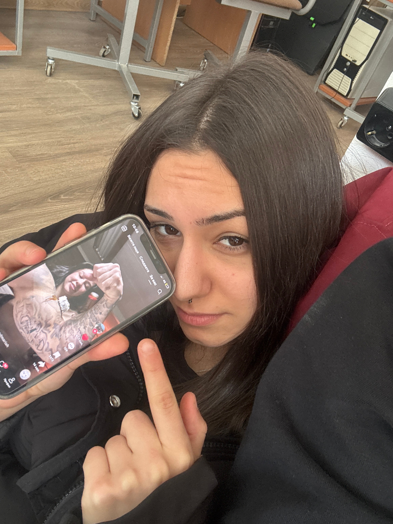 A young woman with long dark hair is lying down, holding a smartphone in her left hand, and pointing at it with the index finger of her right hand. The phone displays a TikTok video of another woman w…read more