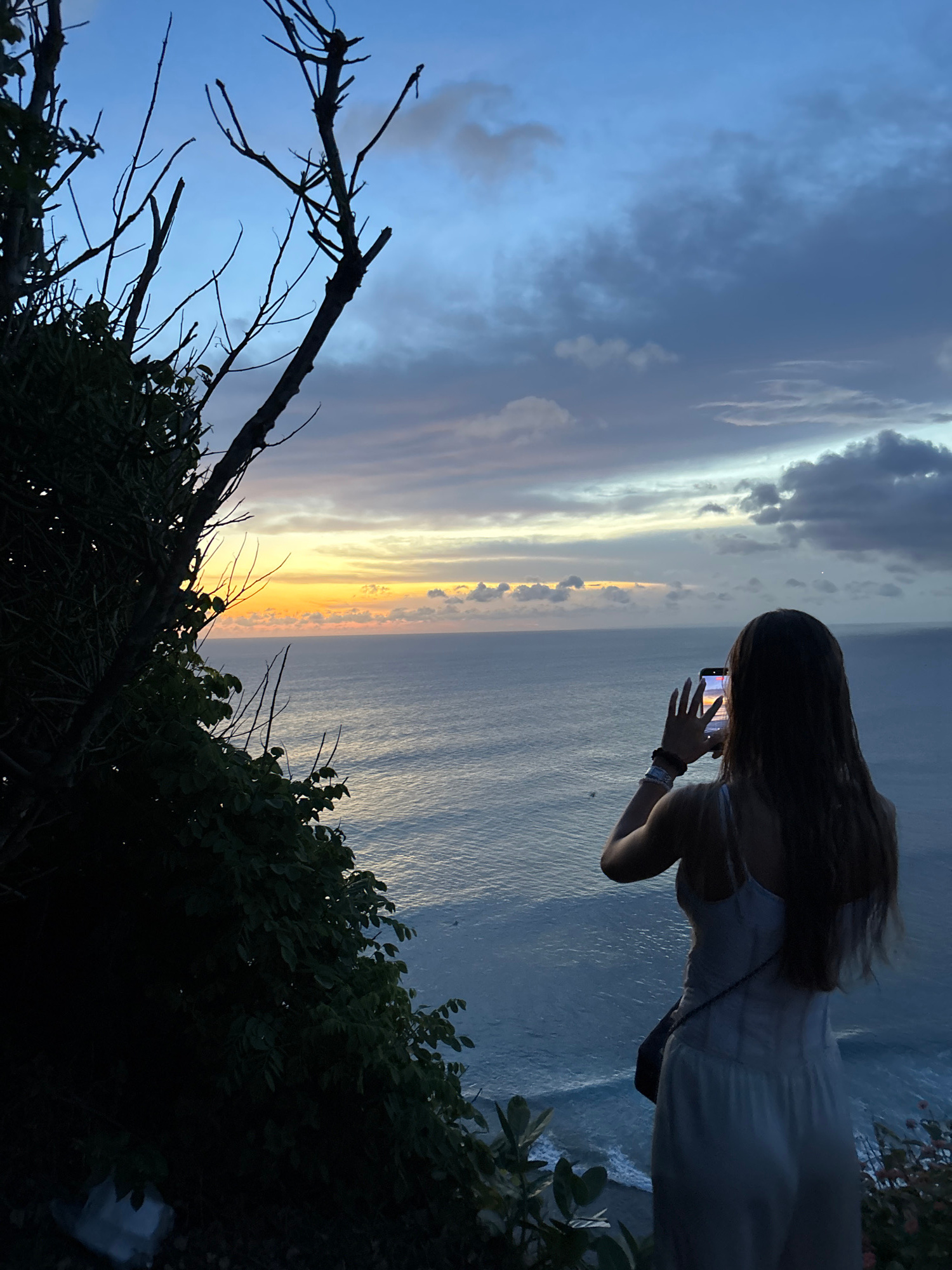 A sideways medium shot depicts a person taking a photo with their smartphone. The person is standing near a cliff, looking out over the ocean. The sky is a mix of dark blue and grey clouds with a stri…read more