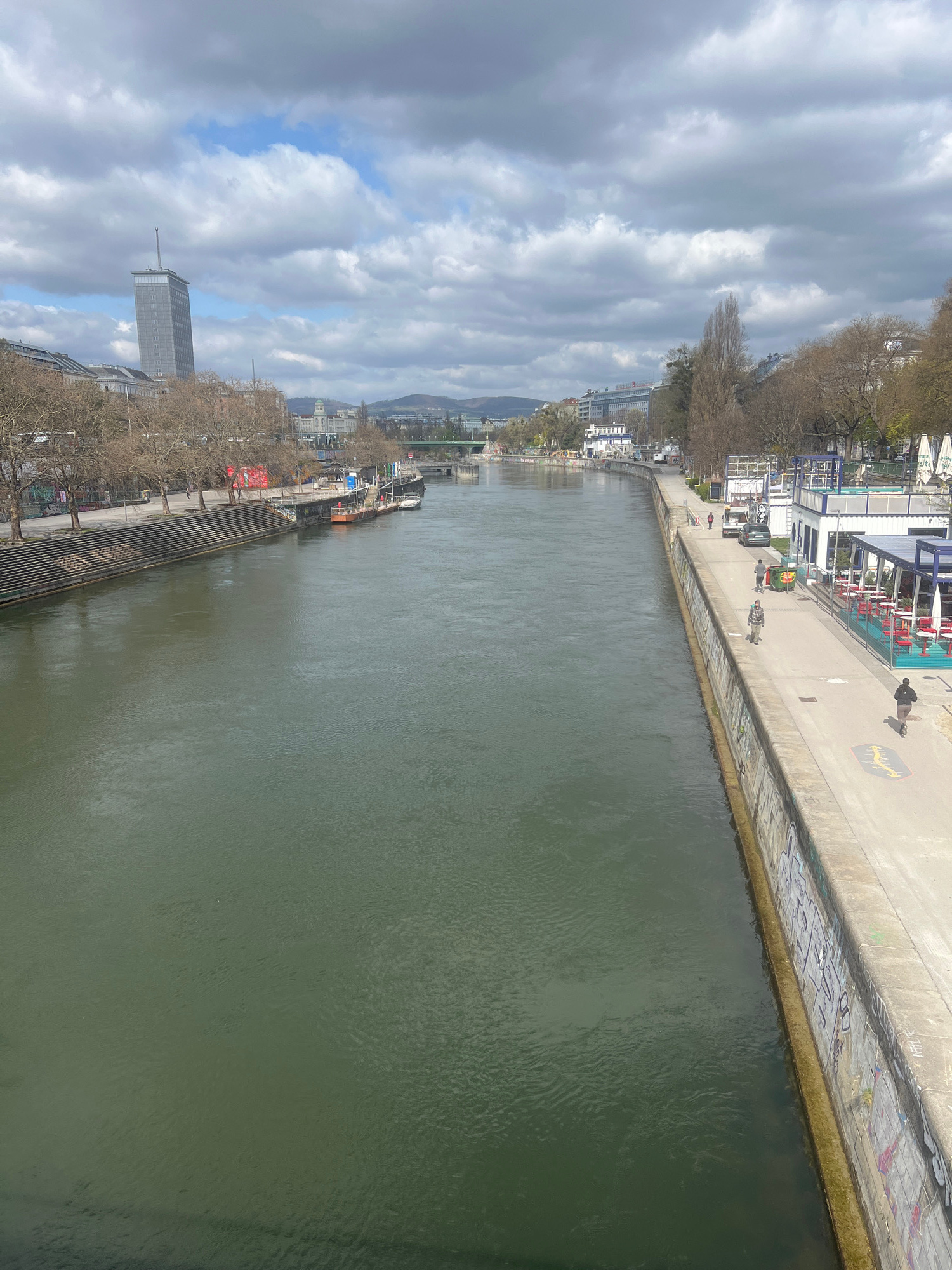 The photograph captures a view of Vienna, Austria, featuring the Donaukanal (Danube Canal) as the central element. The canal stretches lengthwise through the image, its green water reflecting the sky.…read more