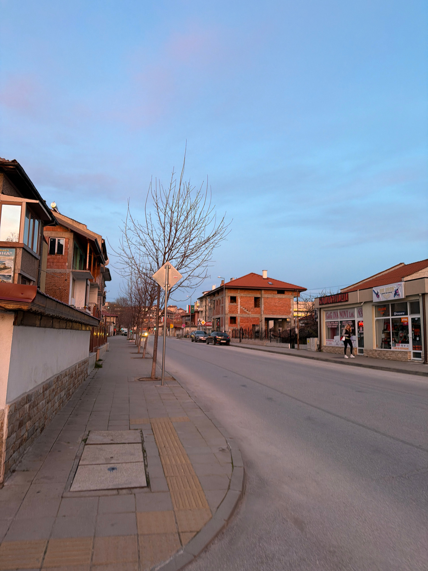 The image shows a street scene in Panagyurishte, Bulgaria. The camera appears to be positioned on the sidewalk, looking down the street. The sky is a pale blue with hints of pink, suggesting either su…read more