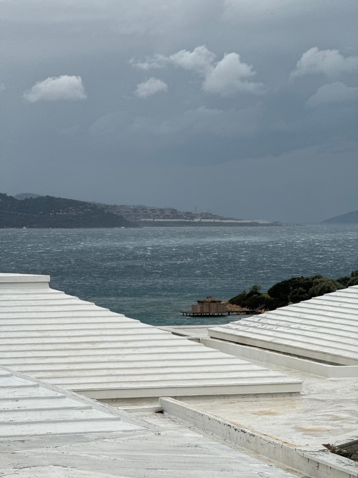 The image shows a view of the Aegean Sea from what appears to be a building or structure in Bodrum, Turkey. The foreground includes part of a white, corrugated exterior wall, and through it, the view reveals a large expanse of water stretching towards the horizon. In the distance, a coastal city is visible along the shoreline. A smaller peninsula, covered with vegetation, juts out into the sea, with a small structure on its edge. The sky is overcast with grey clouds, and the water is a dark blue, appearing choppy and windswept. The overall scene evokes a sense of a coastal landscape under a grey sky. | Open Wire