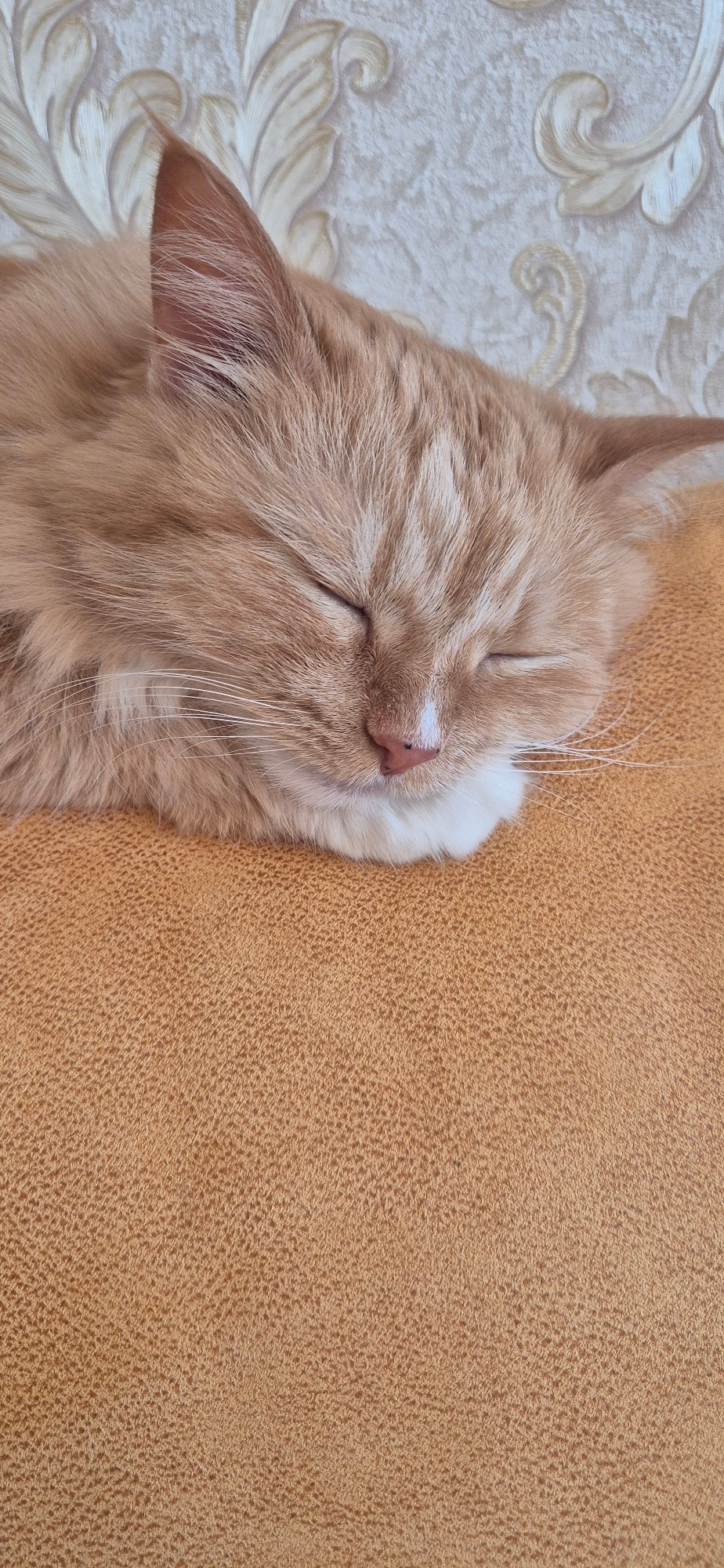 An orange or ginger cat is captured in a close-up, horizontal shot, peacefully sleeping or resting. The cat's eyes are closed, and its pink nose with a lighter, almost white, bridge is a focal point.…read more