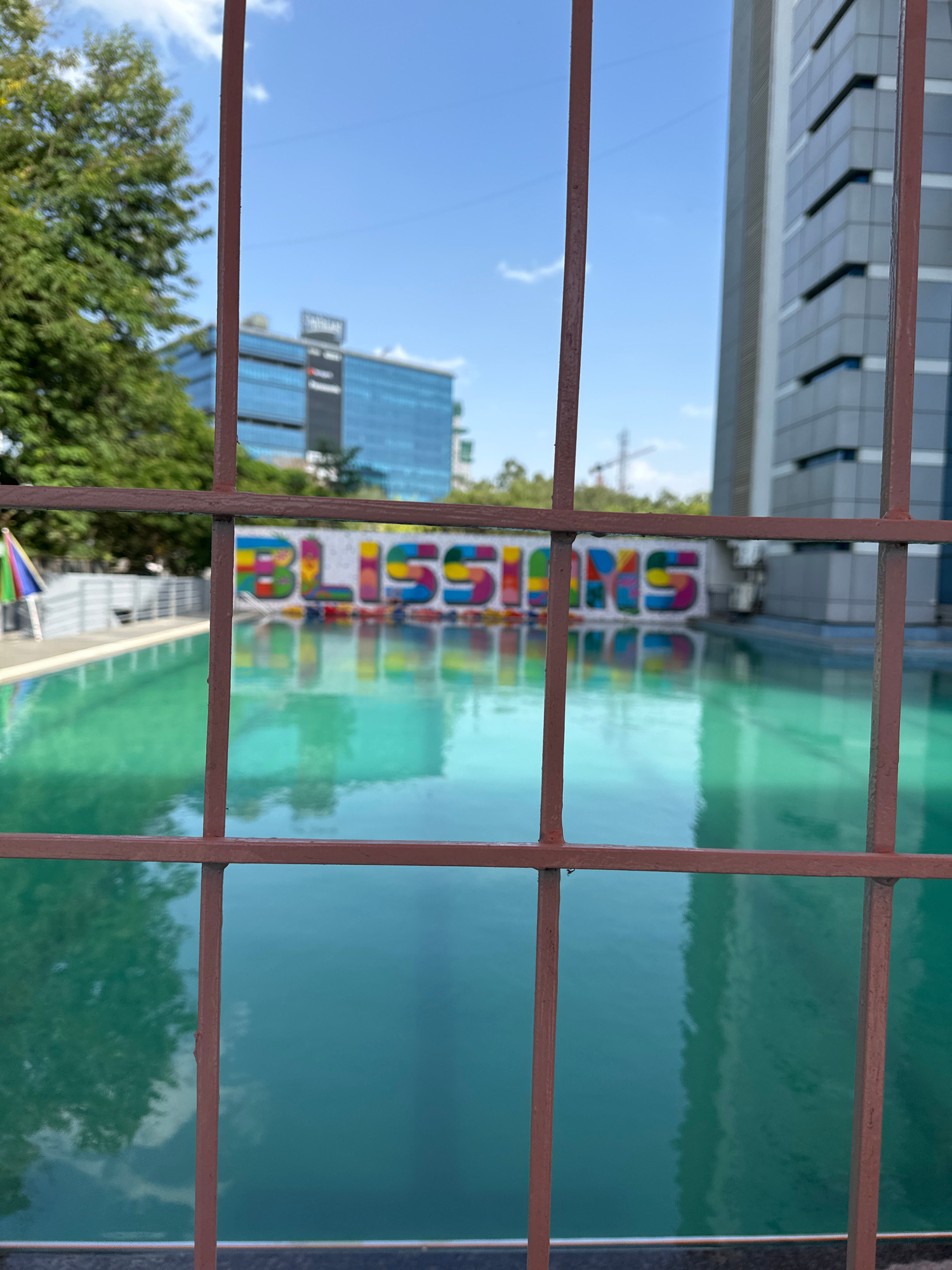 The image shows a view through a metal grid. Reflected in a glass surface behind the grid, presumably water in a pool or fountain, is a colorful sign with the letters "BELTSVILLE". The reflection also…read more