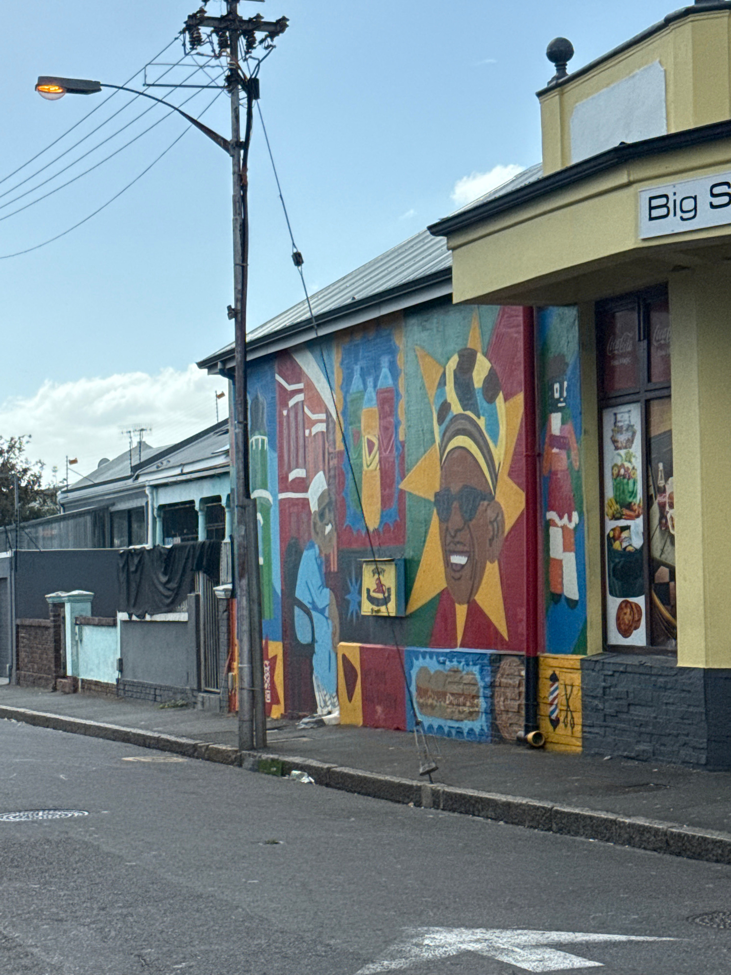The image shows a side of a building with a mural in Cape Town, South Africa. The mural is composed of several images including a portrait of a Black man with a starburst behind him. Other images incl…read more