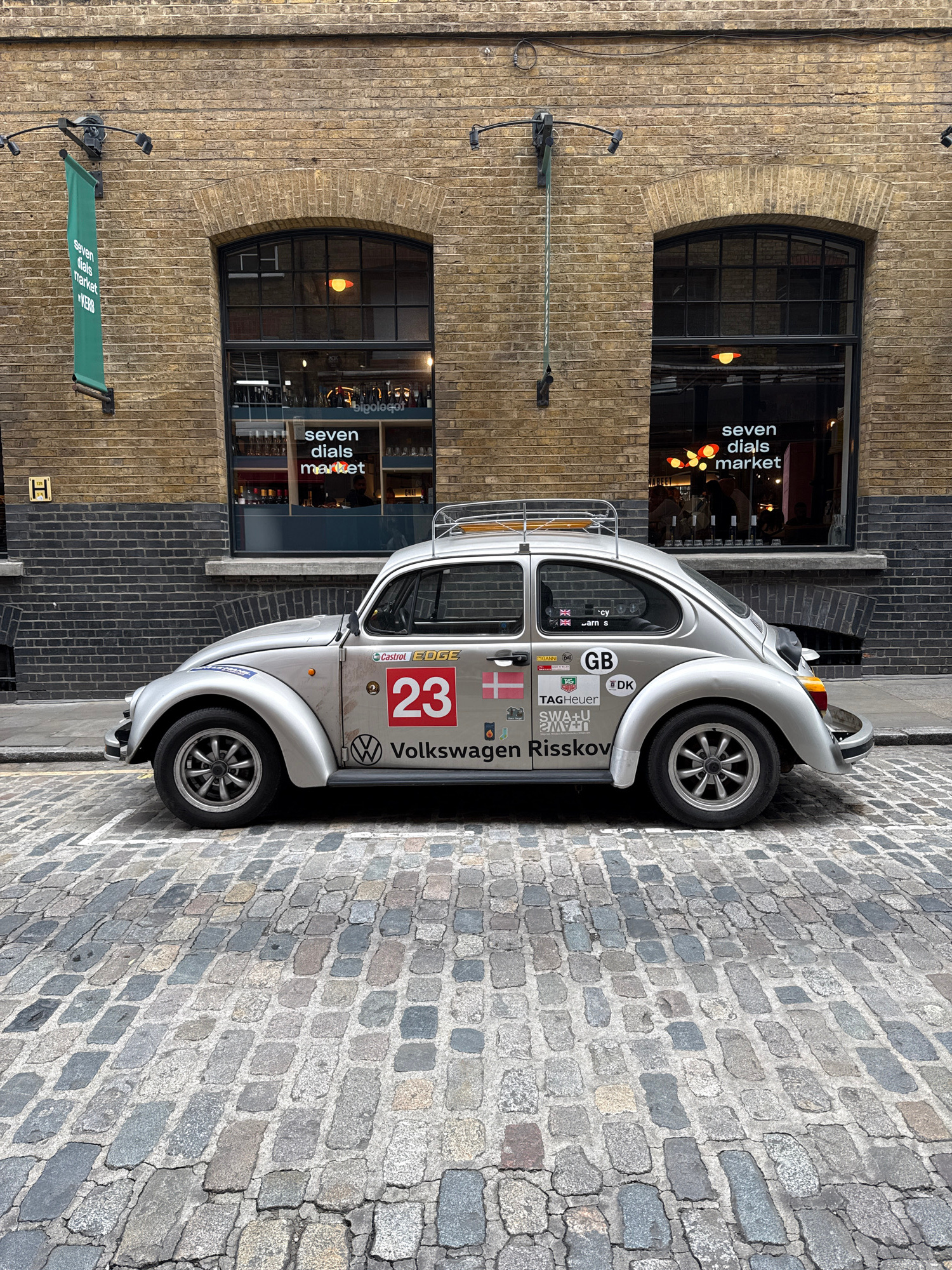 A silver Volkswagen Beetle is parked on a cobblestone street in London, UK, next to a brick building. The car is facing right. It has stickers and the number "23" prominently displayed. "Volkswagen Ri…read more