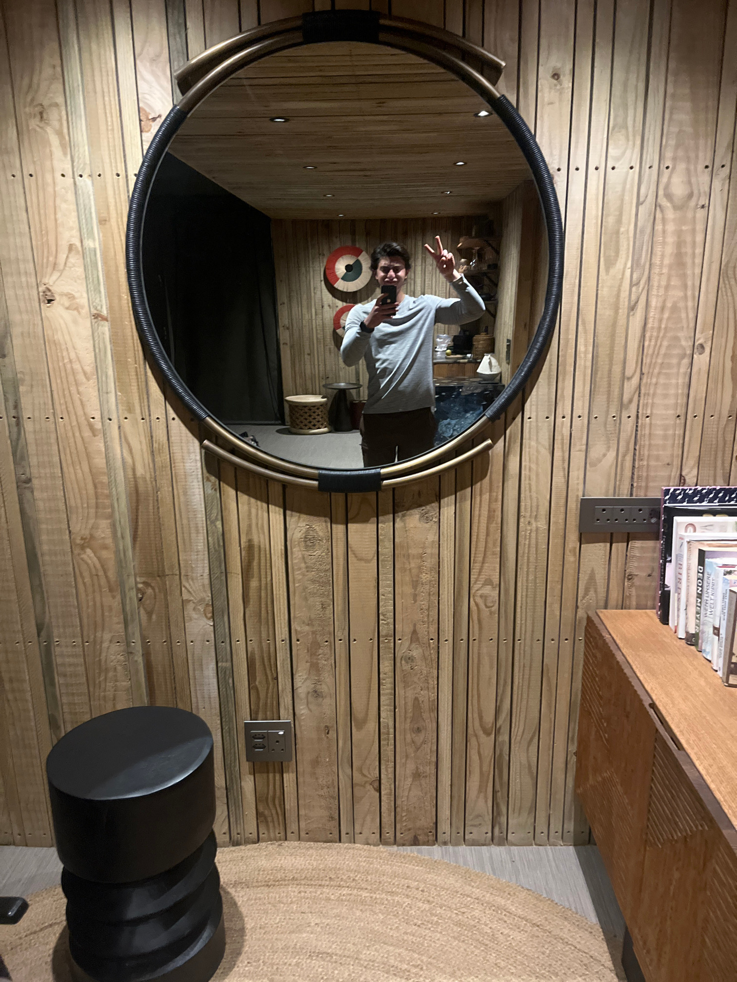 A man stands in a room, facing a round mirror and holding a mobile phone to take a picture of himself. The room features a wall made of horizontal wooden planks. In the background, visible through the…read more