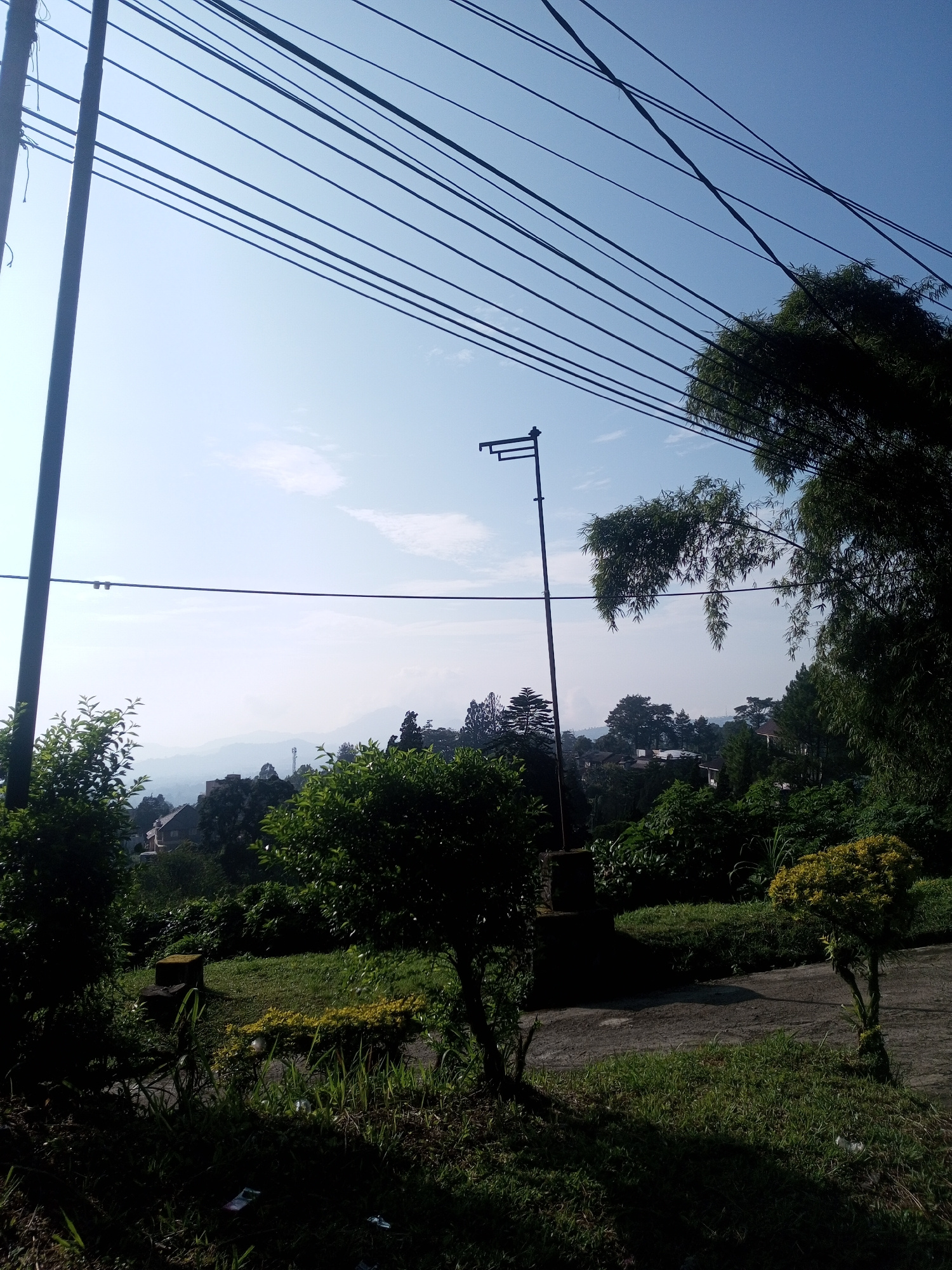 The image depicts a daytime scene in Phouviang-Gnai, Laos. Overhead power lines dominate the top of the frame against a pale blue sky with a few scattered clouds. A tall, dark metal post with an appar…read more