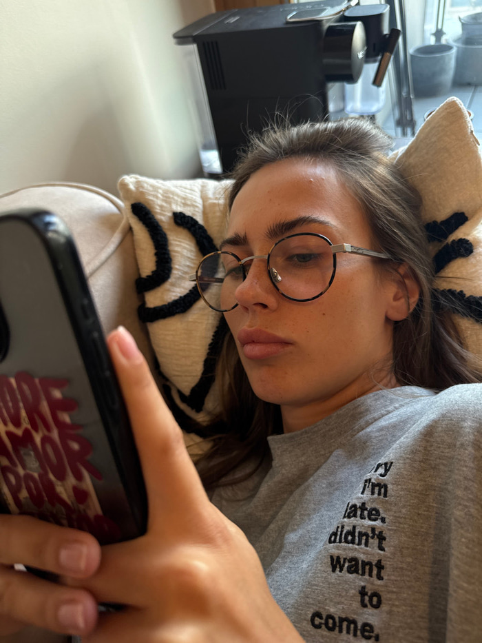 A female individual, estimated to be between 20 and 35 years old, is depicted reclining on a beige upholstered sofa in an indoor residential setting in Warsaw, Poland. Her head rests against a cream-c…read more