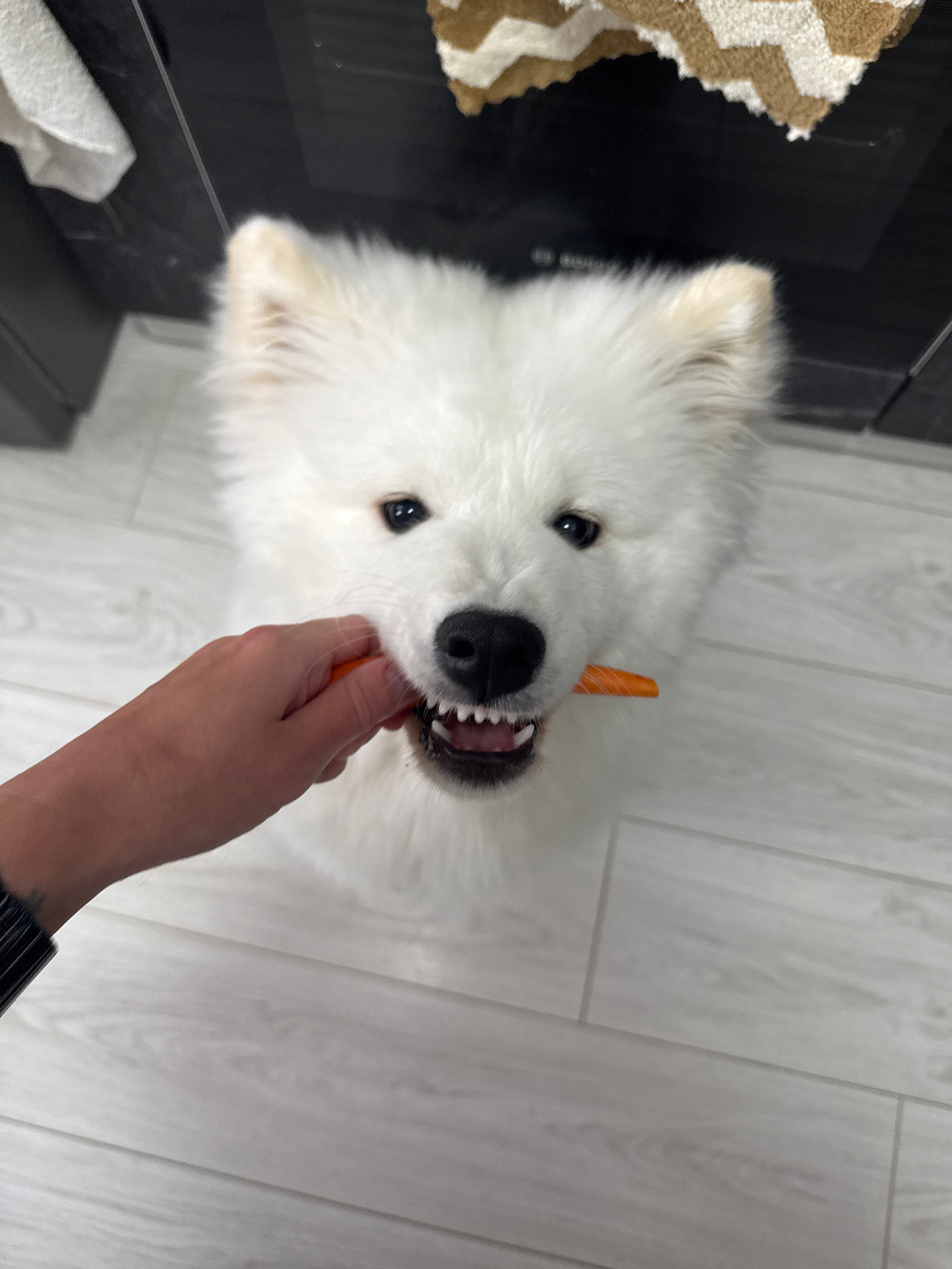 A white Samoyed dog is being fed a carrot stick by a person's hand. The dog is facing the camera with its mouth open, exposing its teeth. The person's hand is holding the carrot stick near the dog's m…read more