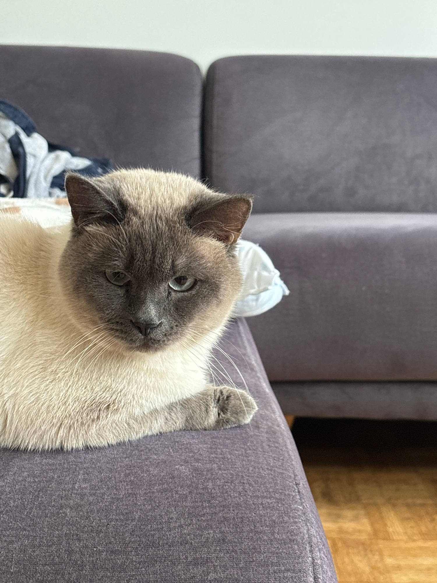 A light brown and grey Siamese cat is positioned on the right side of the frame, leaning its head to the left and looking directly at the camera. Its right paw is visible, resting on the edge of a greβ¦read more