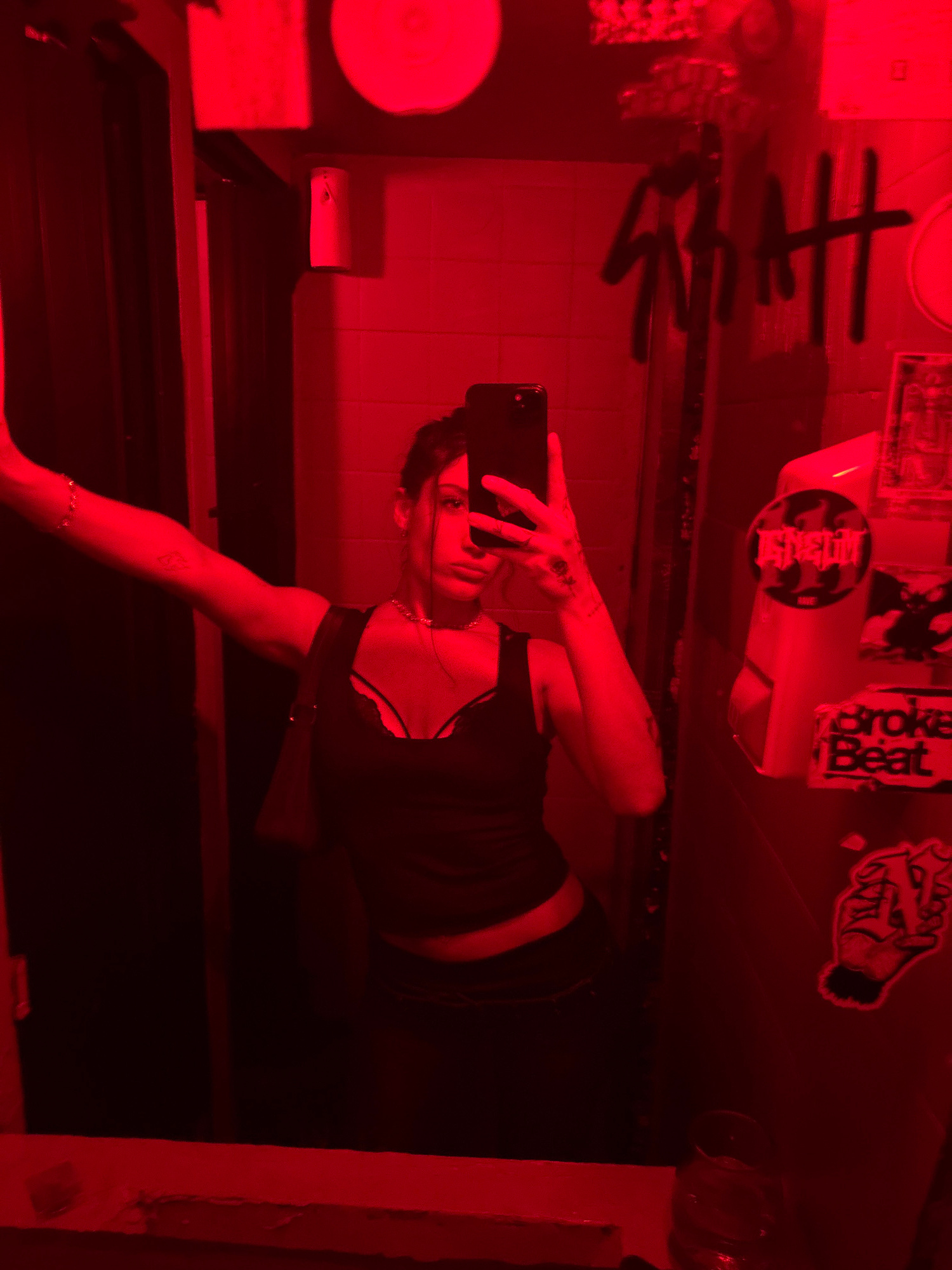 A person takes a mirror selfie in a red-lit bathroom. The subject is holding a smartphone and is wearing a dark top. Behind them, the wall has tiles, and there are various stickers and graffiti. A toi…read more