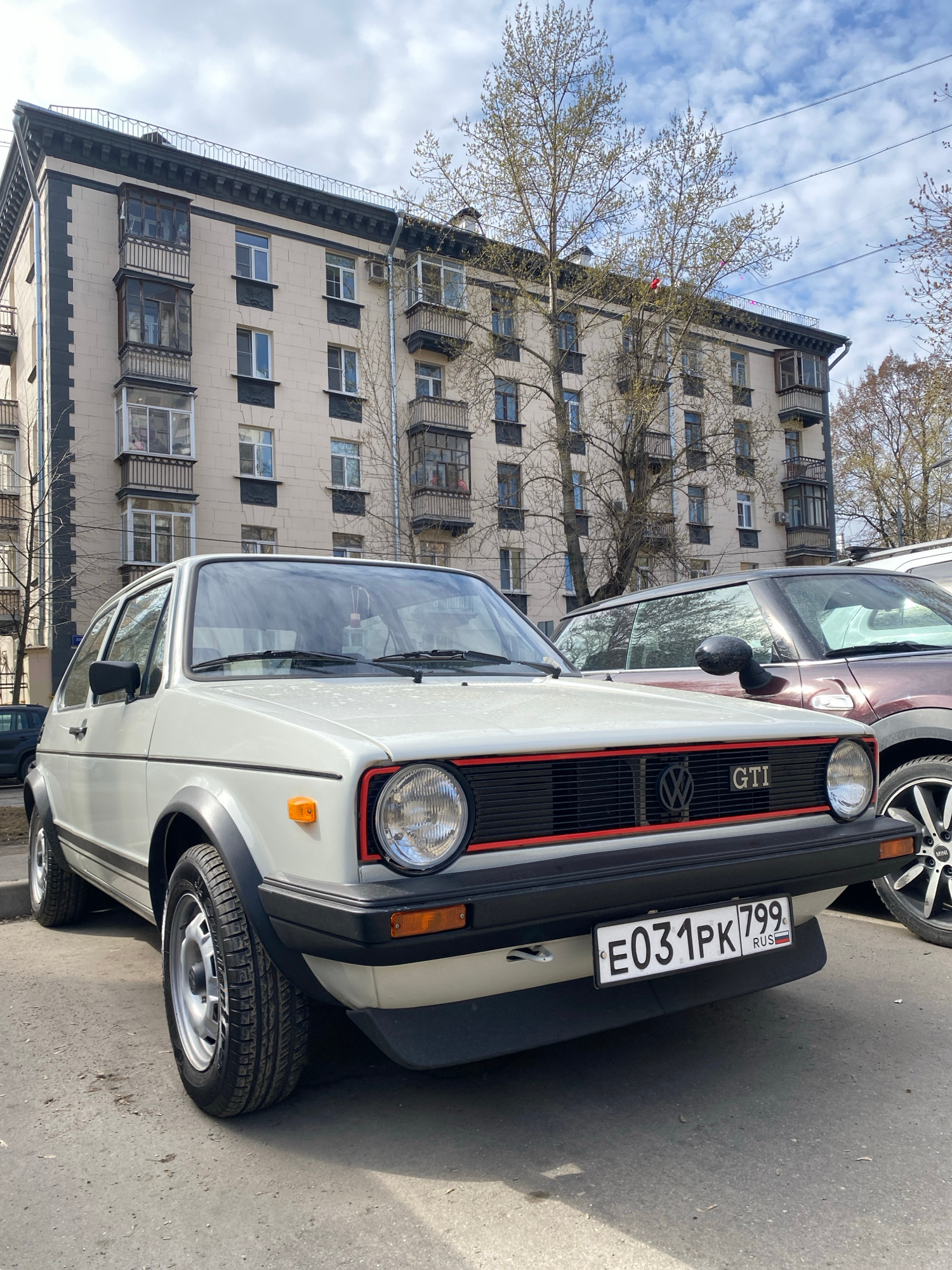 A slightly tilted eye-level shot captures the front of a white Volkswagen Golf GTI with the license plate "E031PK 799 RUS," parked on a city street in Khimki, Russia. The car's red-trimmed black grill…read more