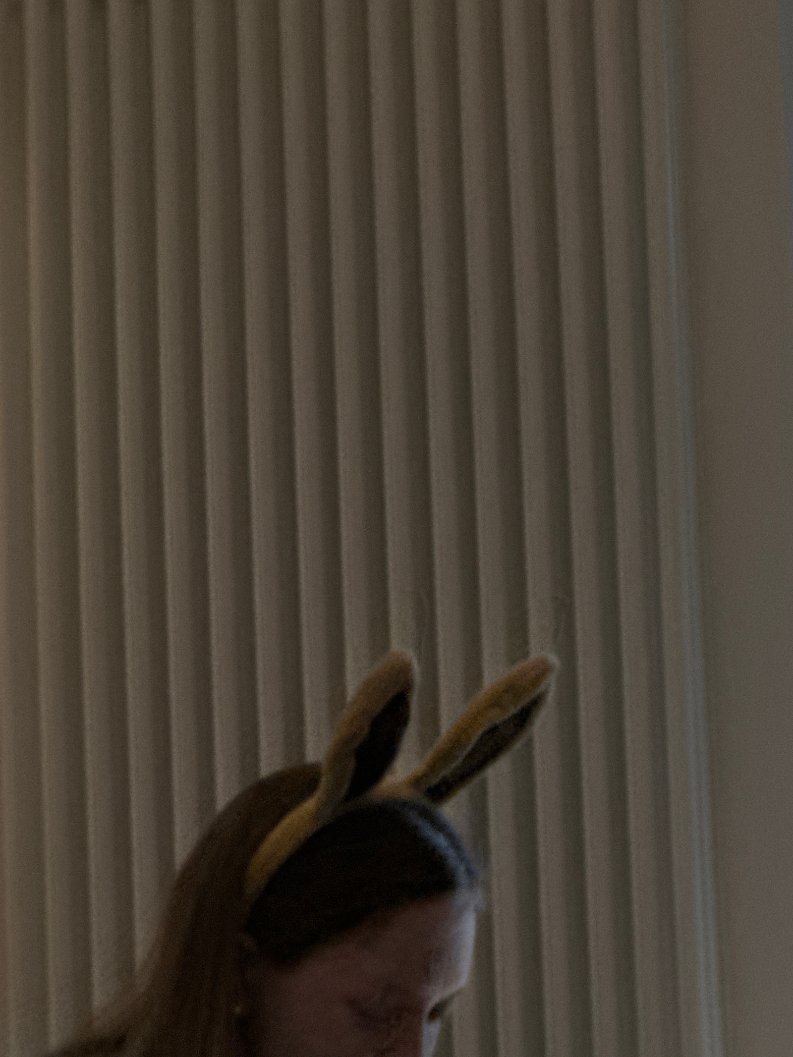 The image displays a partial, close-up view of an individual located indoors in Erba, Italy. The subject's head, from the forehead upwards, is visible, with dark hair. A prominent brown-toned, plush h…read more