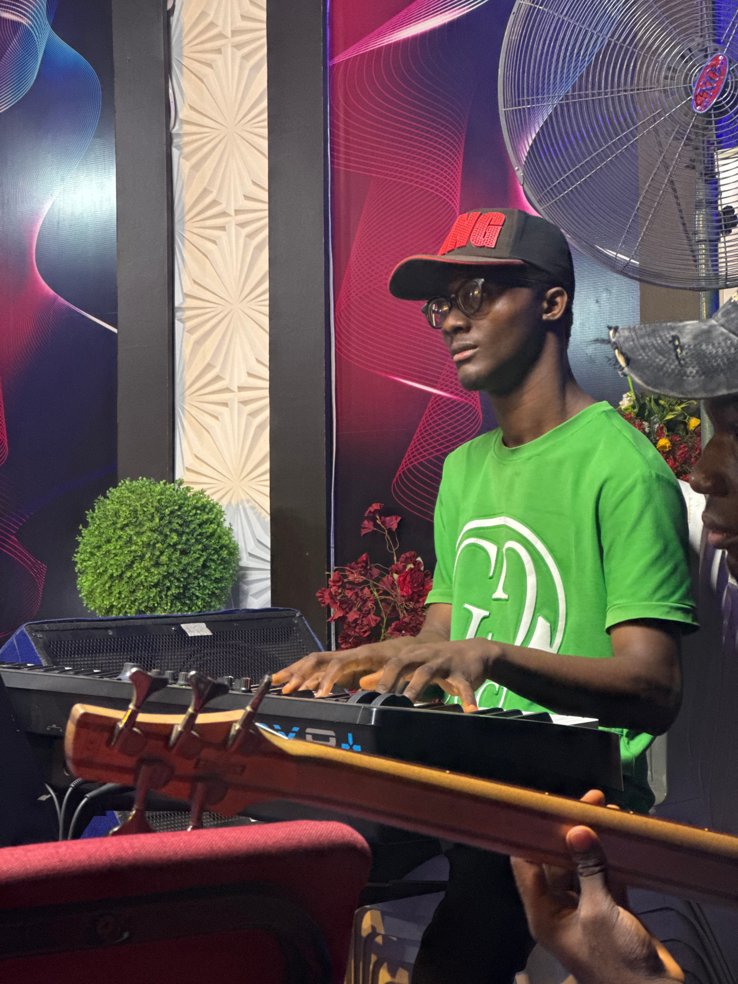 A medium shot captures a musician wearing a green t-shirt and a black baseball cap playing a keyboard. His hands are positioned on the keys, suggesting he is performing. To the right, a person is hold…read more