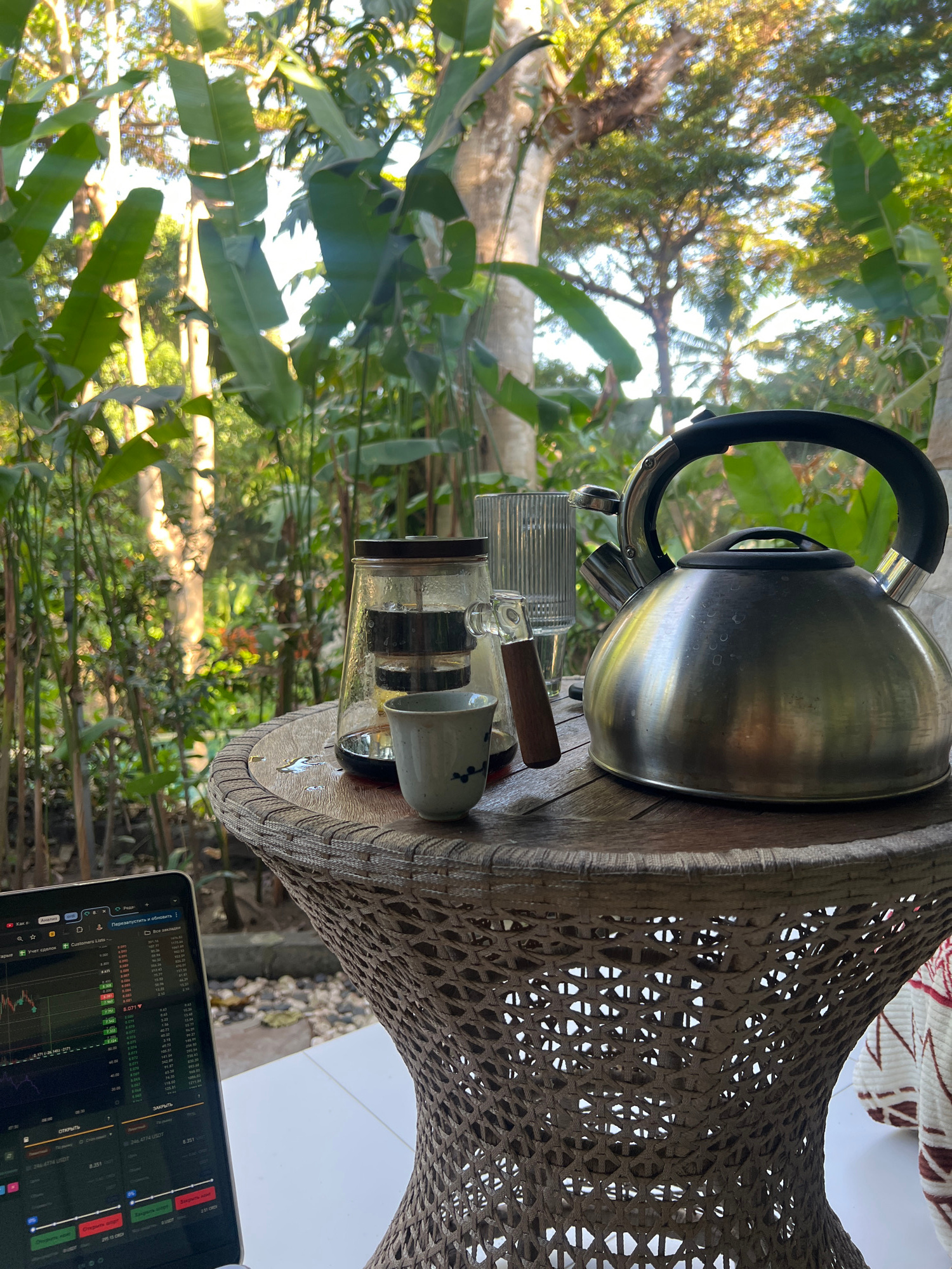This outdoor scene, likely captured in North Kuta, Indonesia, depicts a tranquil yet active setting dominated by a tropical green backdrop. On a woven rattan table with a wooden top, several objects a…read more