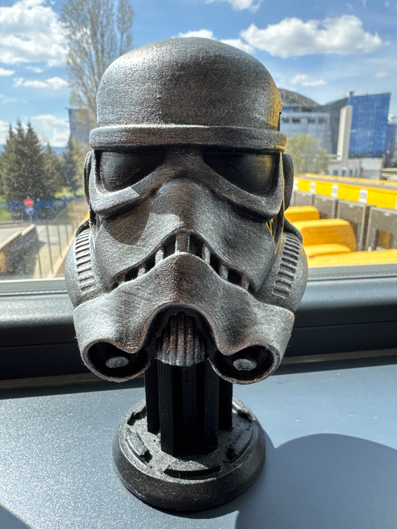 A gray, metallic Stormtrooper helmet (likely a 3D-printed model) is mounted on a black, cylindrical base. The helmet is positioned near a window, allowing a view of a city skyline, including buildings…read more