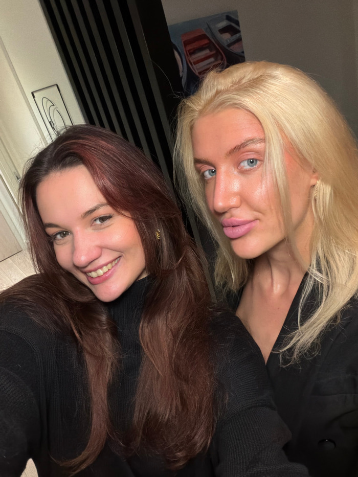 Two women pose in a selfie. The first woman, with light blonde hair, gazes directly at the camera with a neutral expression and light eyes. Her face is fair, with full lips. The second woman, position…read more