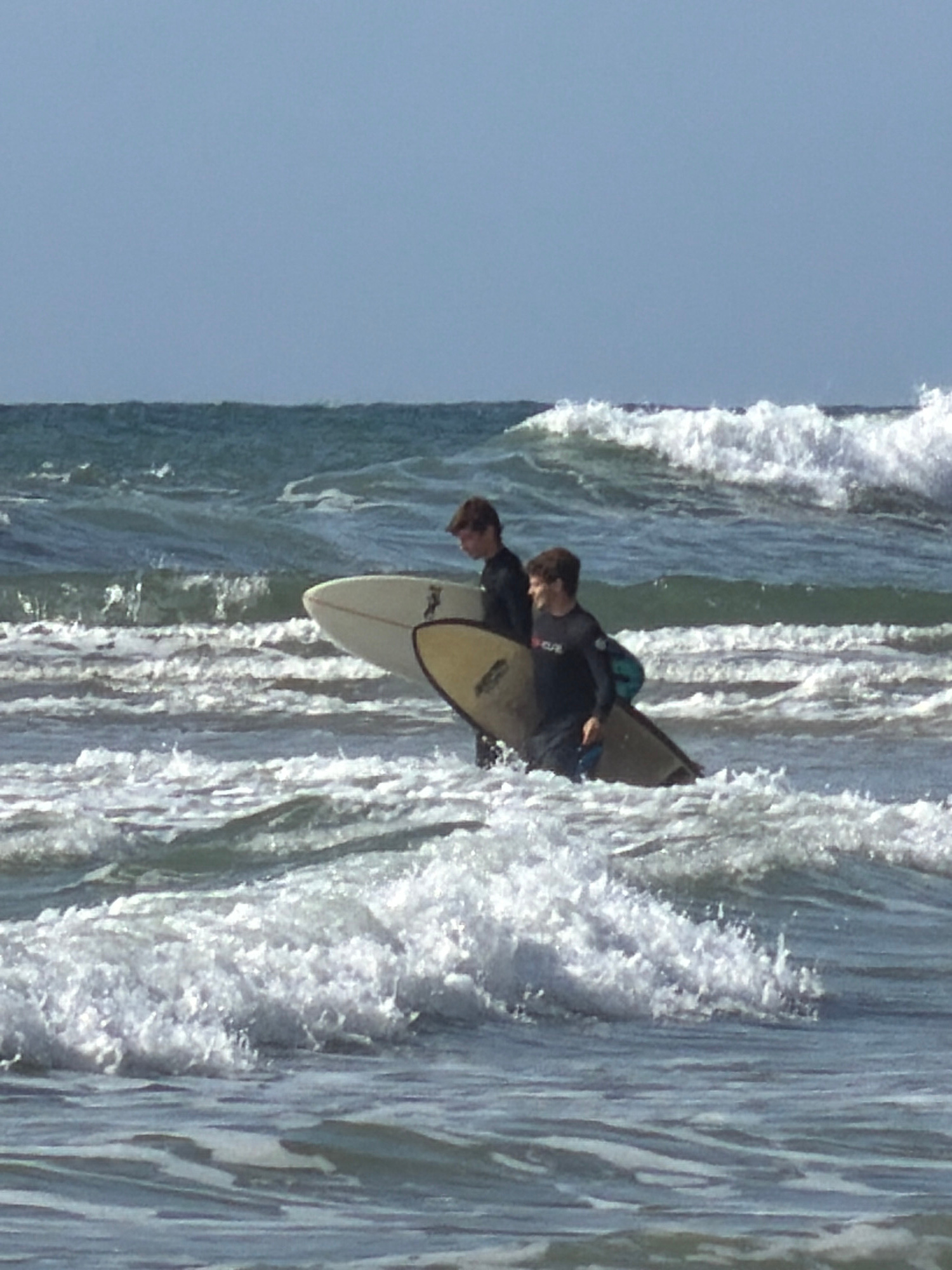 Two people are tandem surfing on a wave. The background shows the ocean and sky. The location is likely the city of Tel-Aviv, Israel.