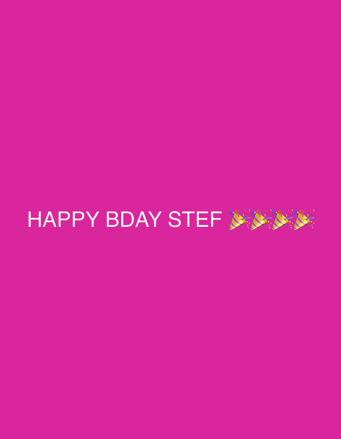 The scene displays a solid magenta background. Centered horizontally and slightly below the vertical midpoint, white uppercase text reads "HAPPY BDAY STEF". Immediately to the right of the text are fi…read more