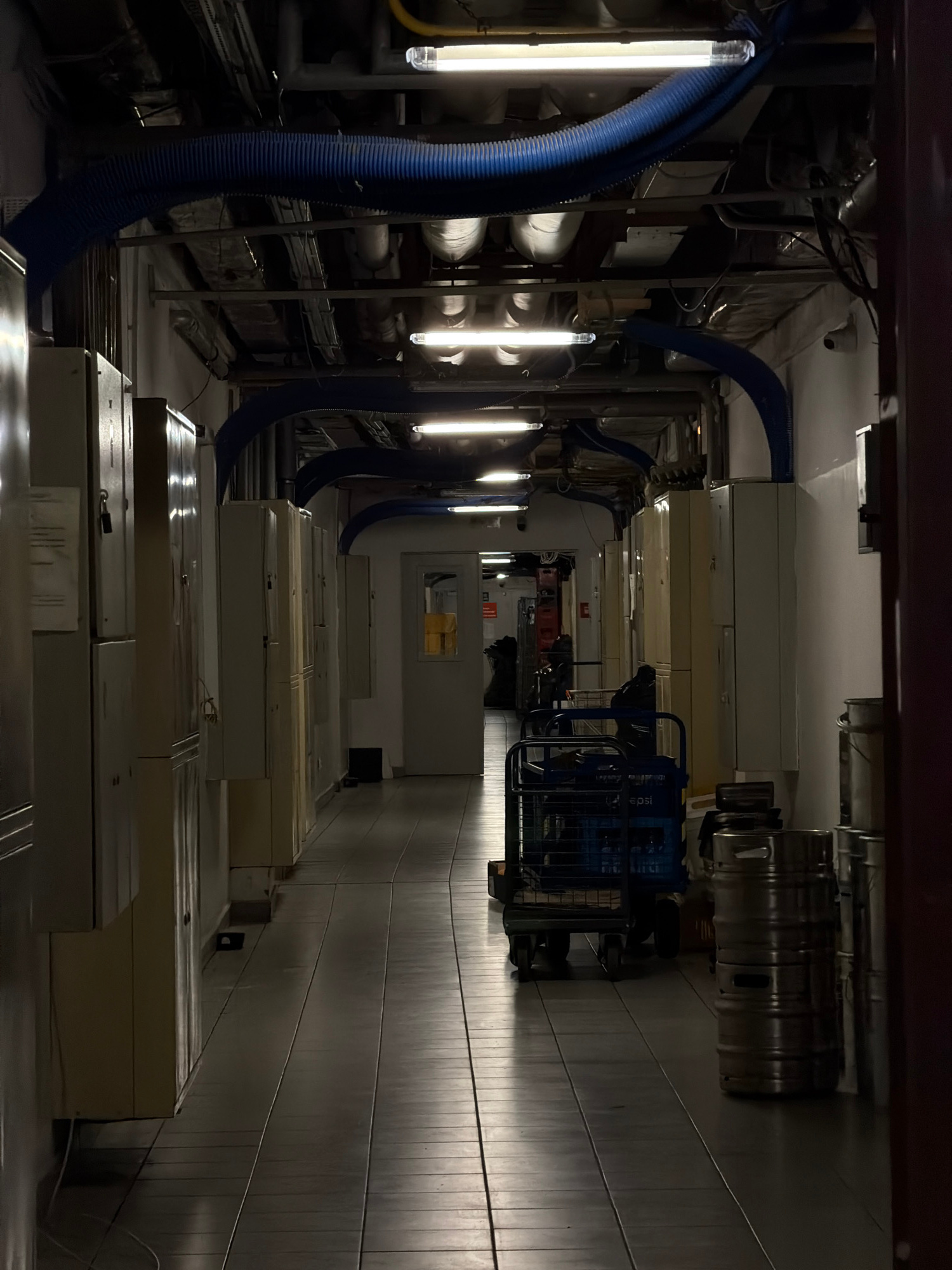 The image depicts a dimly lit corridor, potentially in an industrial or storage area. On the left, thick blue corrugated hoses run vertically, illuminated by fluorescent tube lights. A series of recta…read more