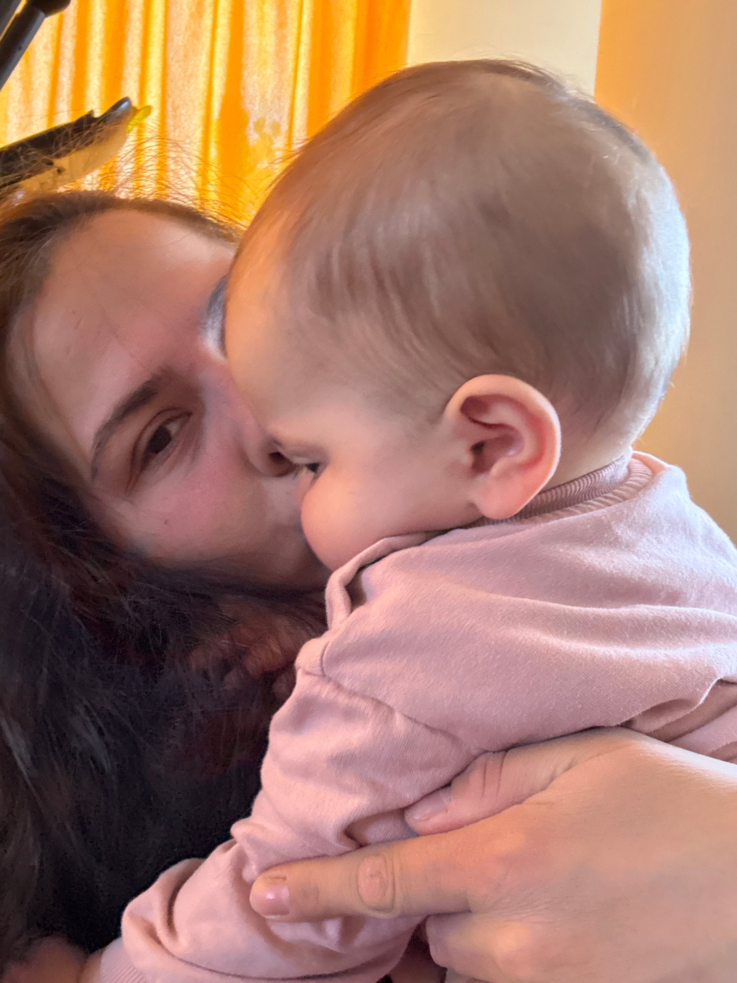A close-up photograph shows an adult and a baby. The adult is lying down, facing upward, with dark, curly hair visible at the bottom of the frame. The baby, dressed in a pink long-sleeved shirt, is po…read more