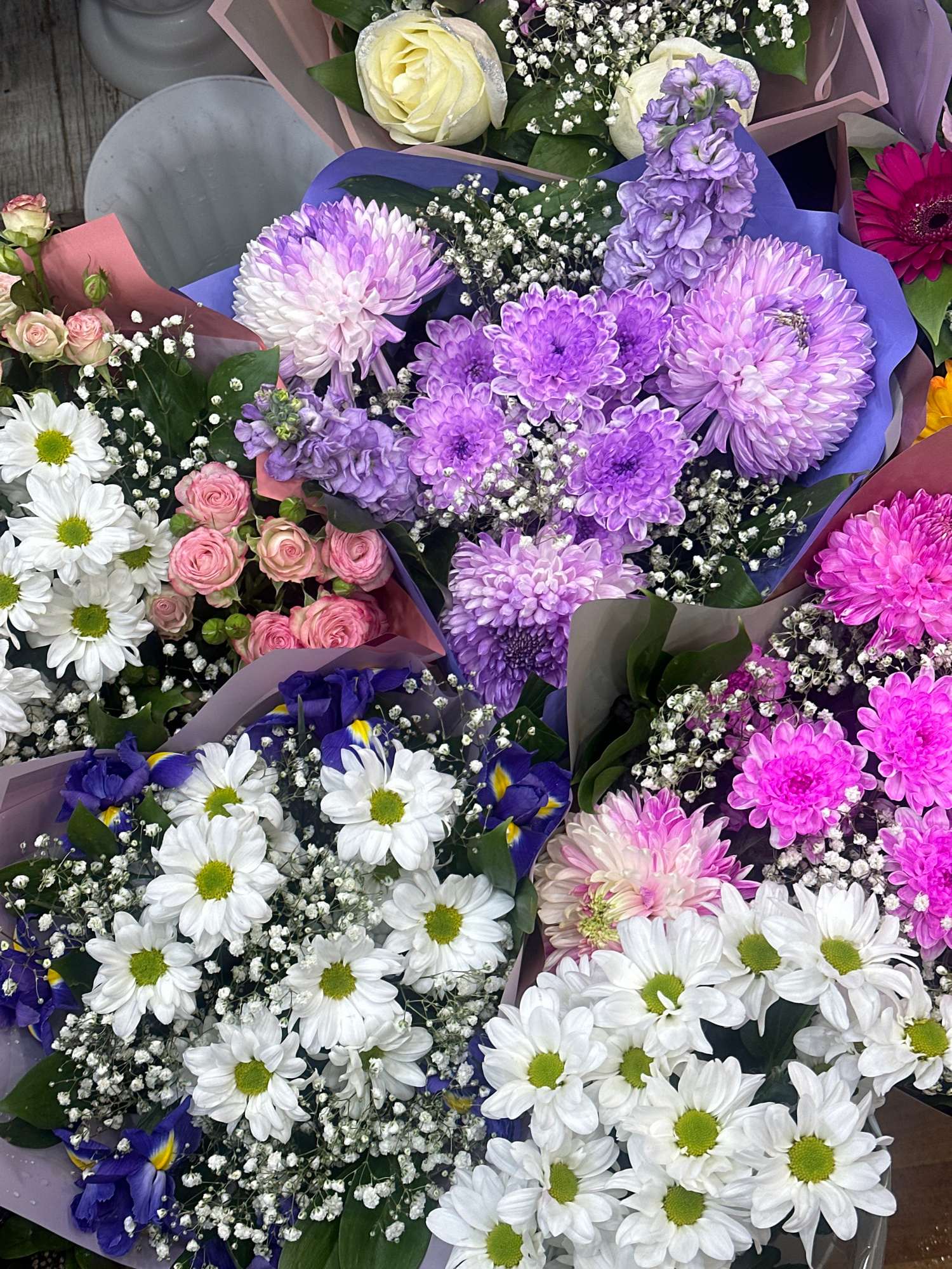 The image shows a variety of flower bouquets. There are bouquets featuring purple chrysanthemums, pink chrysanthemums, white daisies with green centers, and pink roses, all mixed with baby's breath. T…read more