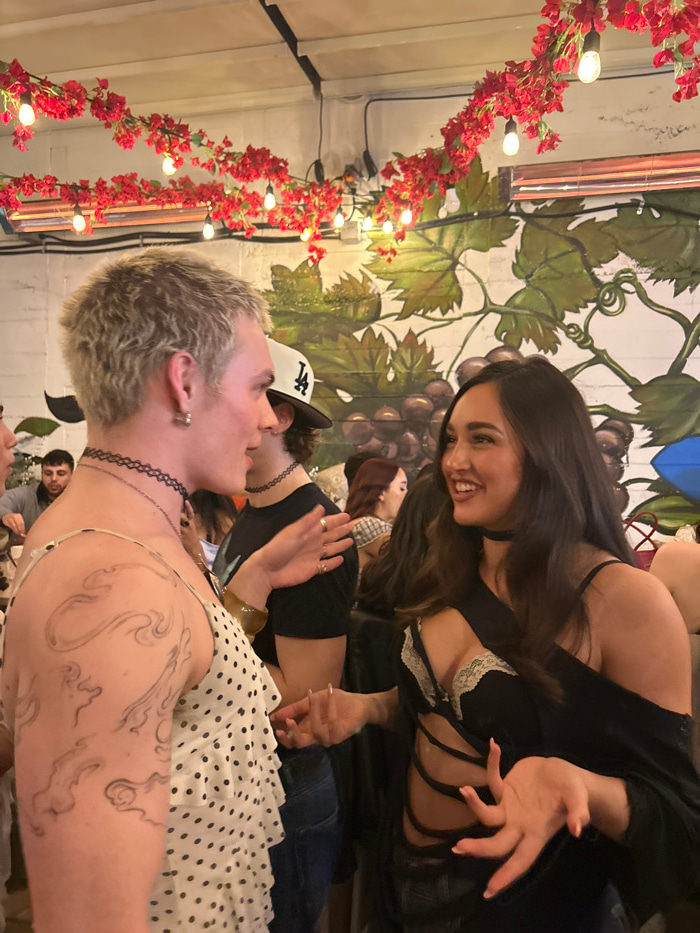 The image depicts two individuals engaged in conversation within a commercial establishment, likely a bar or restaurant, in Vancouver, Canada. In the foreground, a person with short, bleached blonde…read more