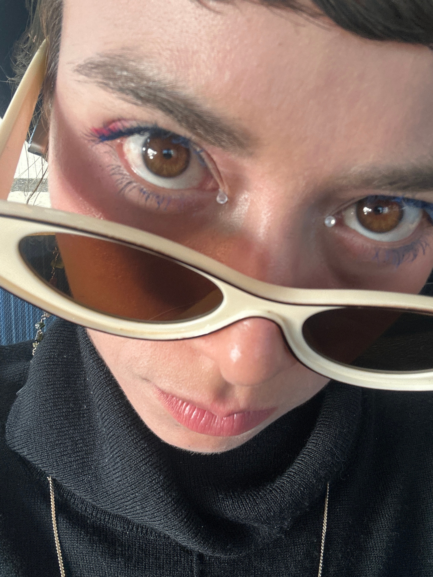 A close-up portrait captures a person's face, oriented approximately 90 degrees counter-clockwise, as they pose in Los Angeles, United States of America. The subject, a young adult, looks slightly upw…read more