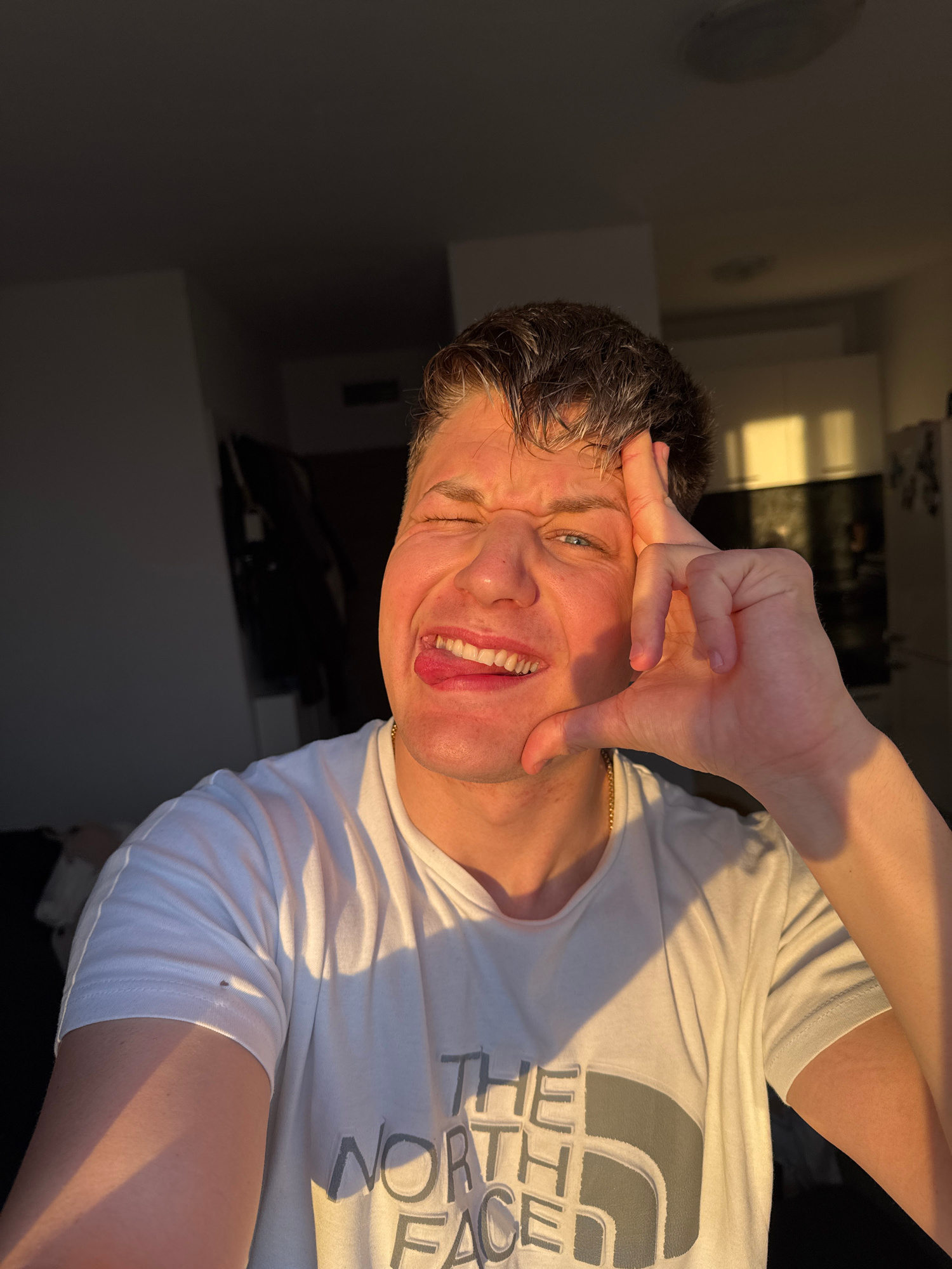 A person is posing for a photo indoors, wearing a white t-shirt with "THE NORTH FACE" printed on it. The person is making a face and has their hand on their face, forming a square-like shape around thβ¦read more