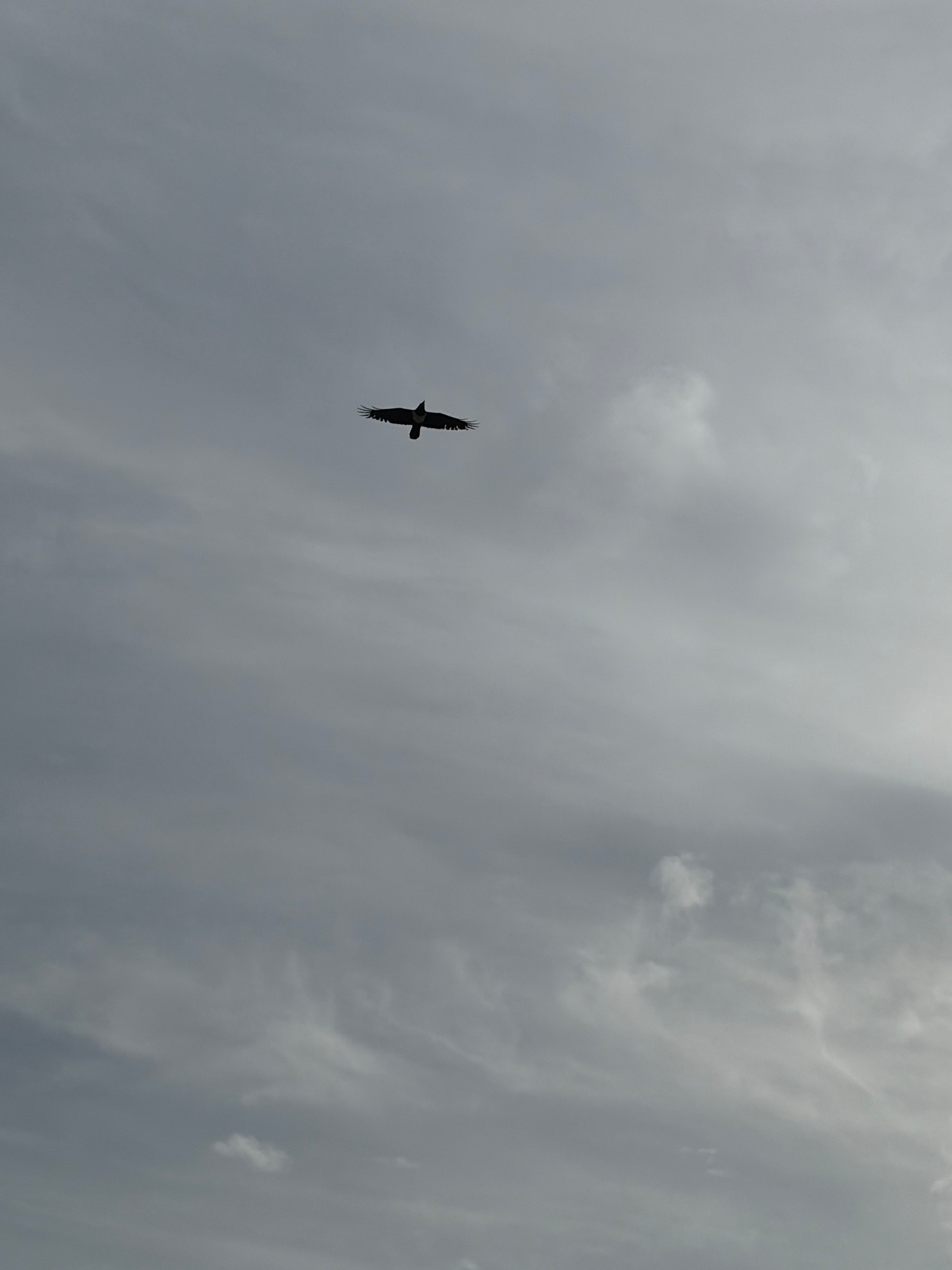 A silhouetted bird is captured in mid-flight against a vast, overcast sky. The bird, dark in color, is positioned in the upper left portion of the frame, with its wings fully extended, suggesting it i…read more