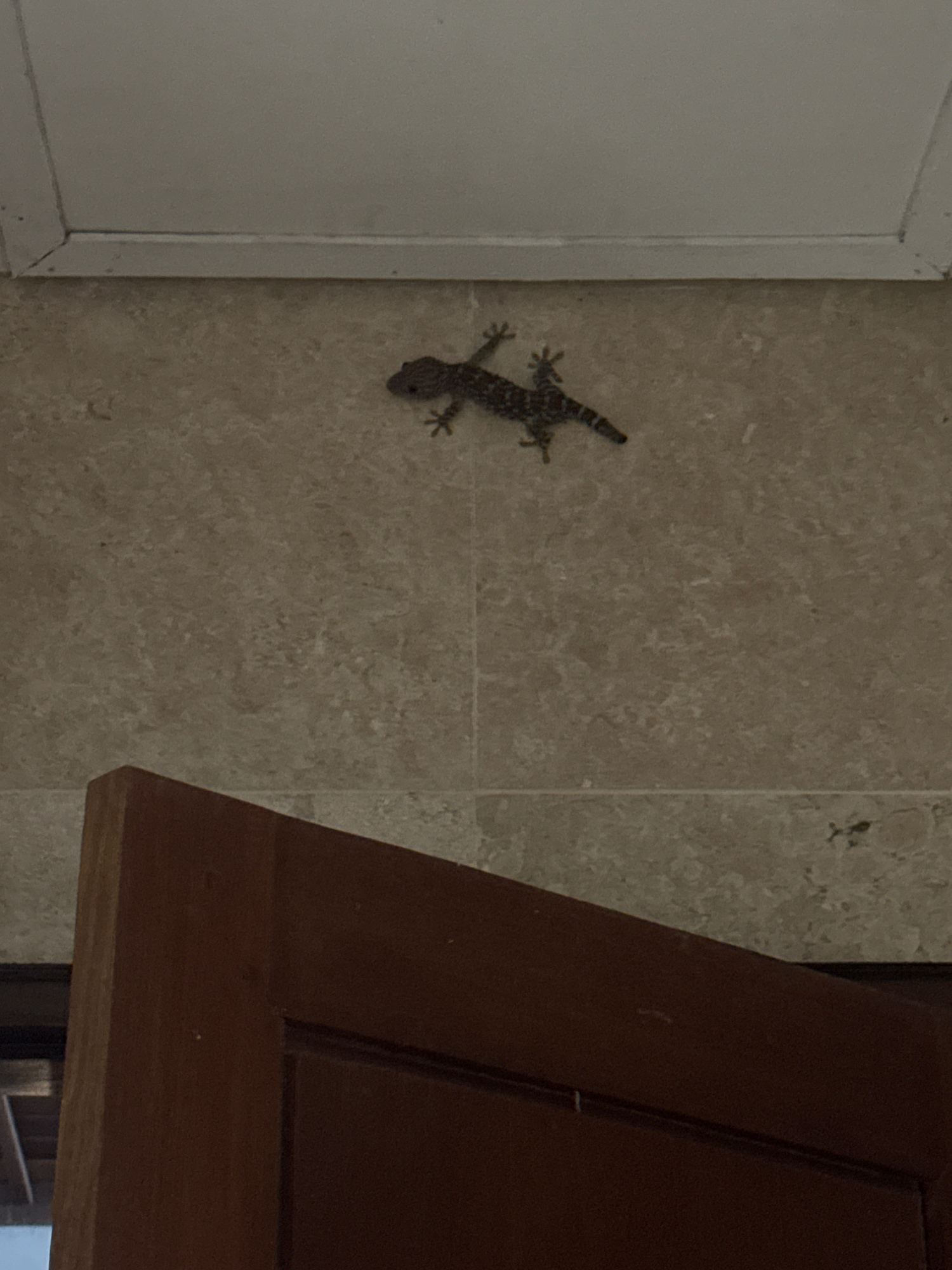 The image captures a small gecko clinging to a light-colored, patterned tiled wall. The gecko, which has a dark, mottled skin pattern, is positioned on the left side of the frame, facing upwards and s…read more