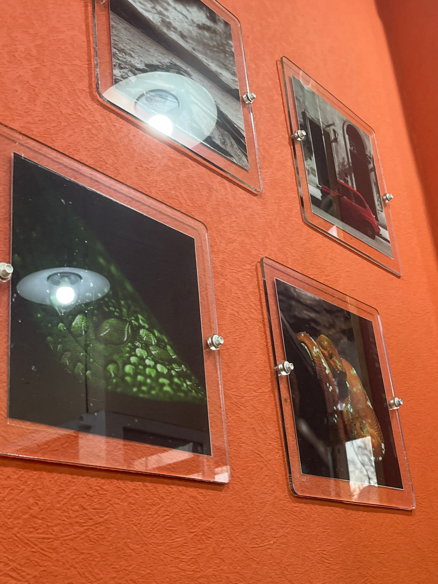 Four framed photos are displayed on an orange textured wall. The frames appear to be made of clear plastic and are attached to the wall with metal screws. The photos depict different subjects: The top…read more