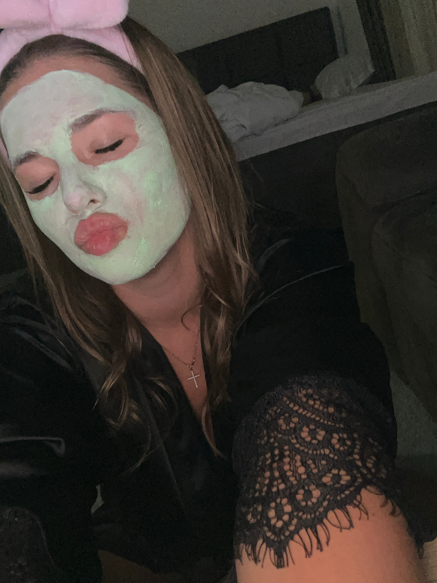 A woman with light brown hair is lying down, wearing a pink headband and a light green face mask with pink accents around her eyes and lips. She is wearing a black top with lace detailing on the shoul…read more