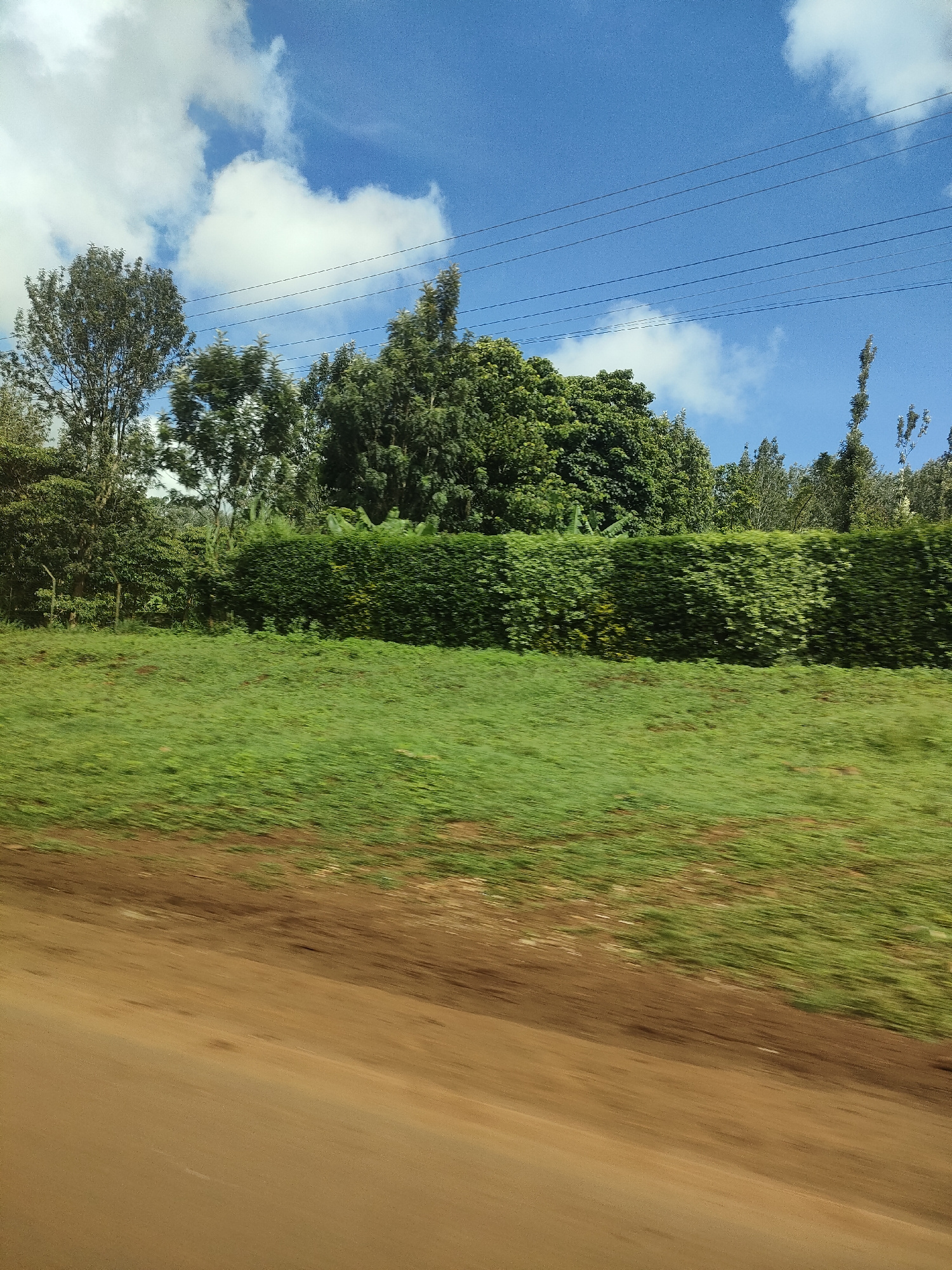 The image depicts a rural scene, likely captured from a moving vehicle. The foreground features a dirt road, transitioning into a vibrant green, grassy area. A dense, trimmed hedge forms a distinct li…read more