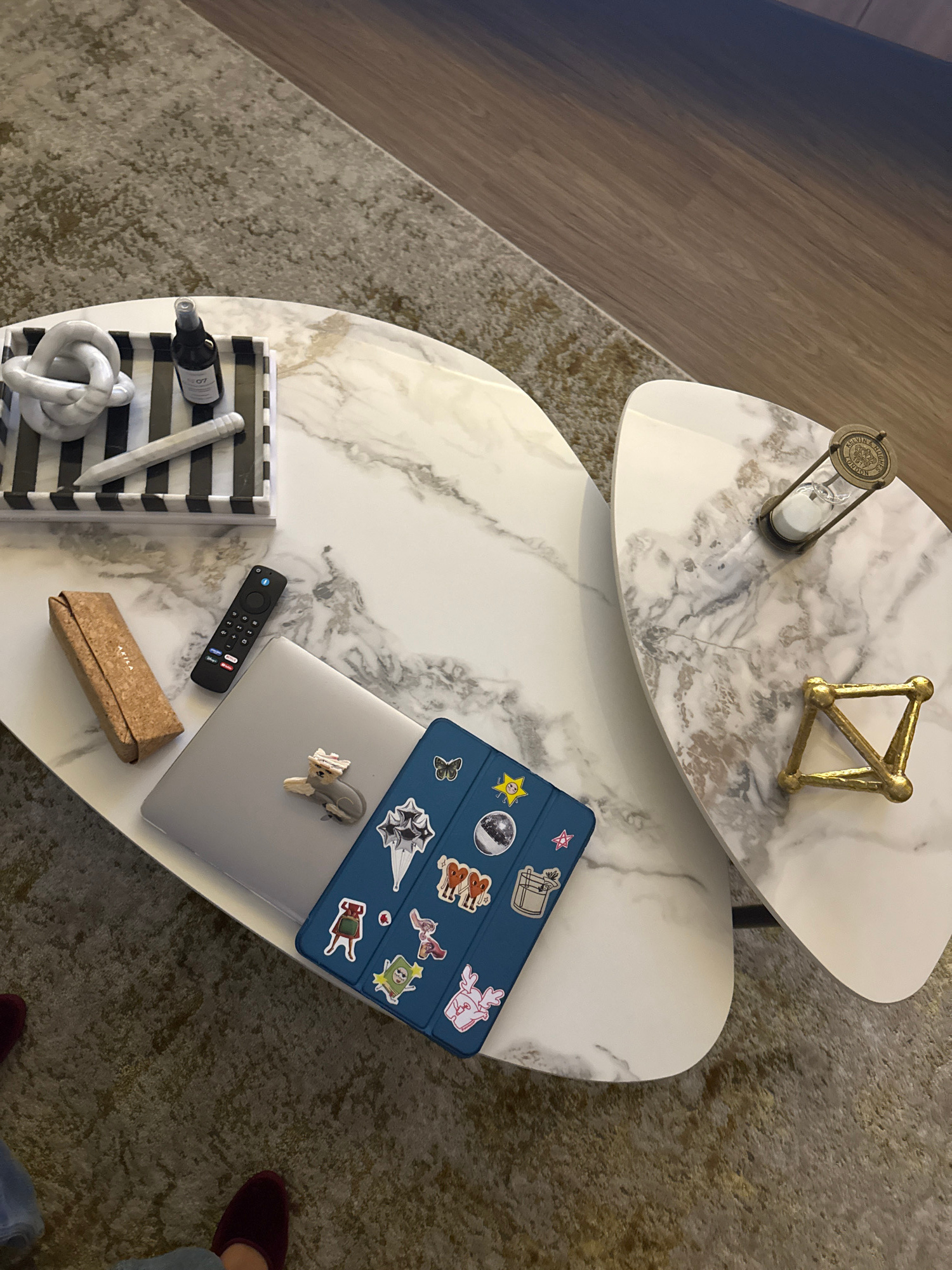 The image shows an overhead view of a two-tiered coffee table with a faux marble finish, likely located in a living room setting. The top tier features an hourglass and a geometric gold-colored object…read more