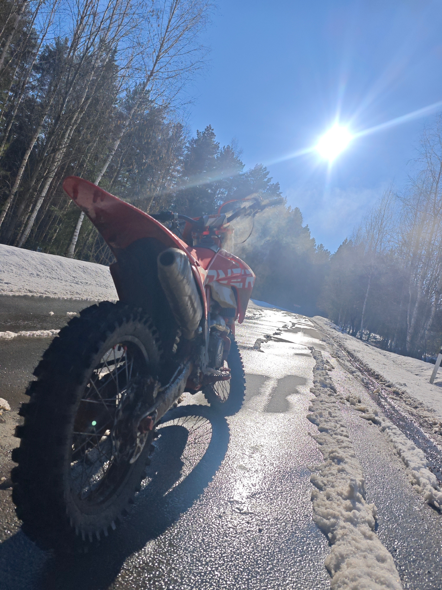 A red dirt bike is parked on an icy road. The road is lined with snow on both sides, and a forest is in the background. The sun is shining brightly, creating a glare in the sky. The location is Прикам…read more