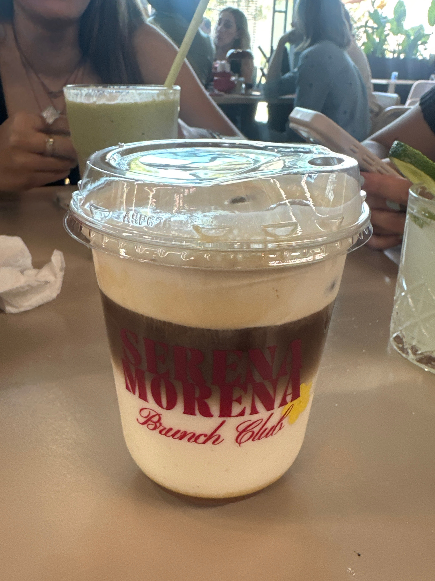 The image shows a group of people gathered at a table. The focus is on a tall, clear plastic cup filled with a layered beverage. The cup has a transparent plastic lid. The drink consists of a dark liq…read more