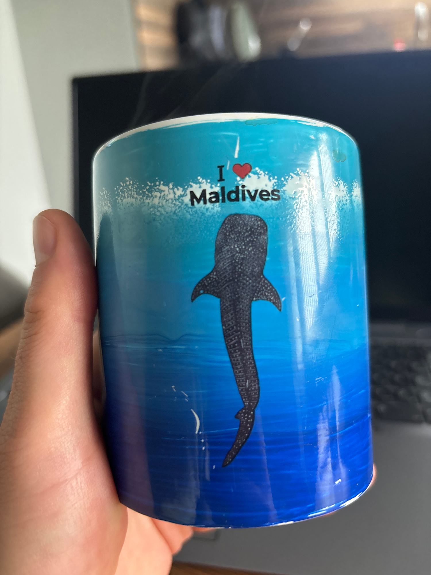 A cylindrical mug is held in someone's hand. The mug is decorated with a gradient of color from light blue to dark blue, depicting an underwater scene. There is a whale shark printed on the mug, along…read more