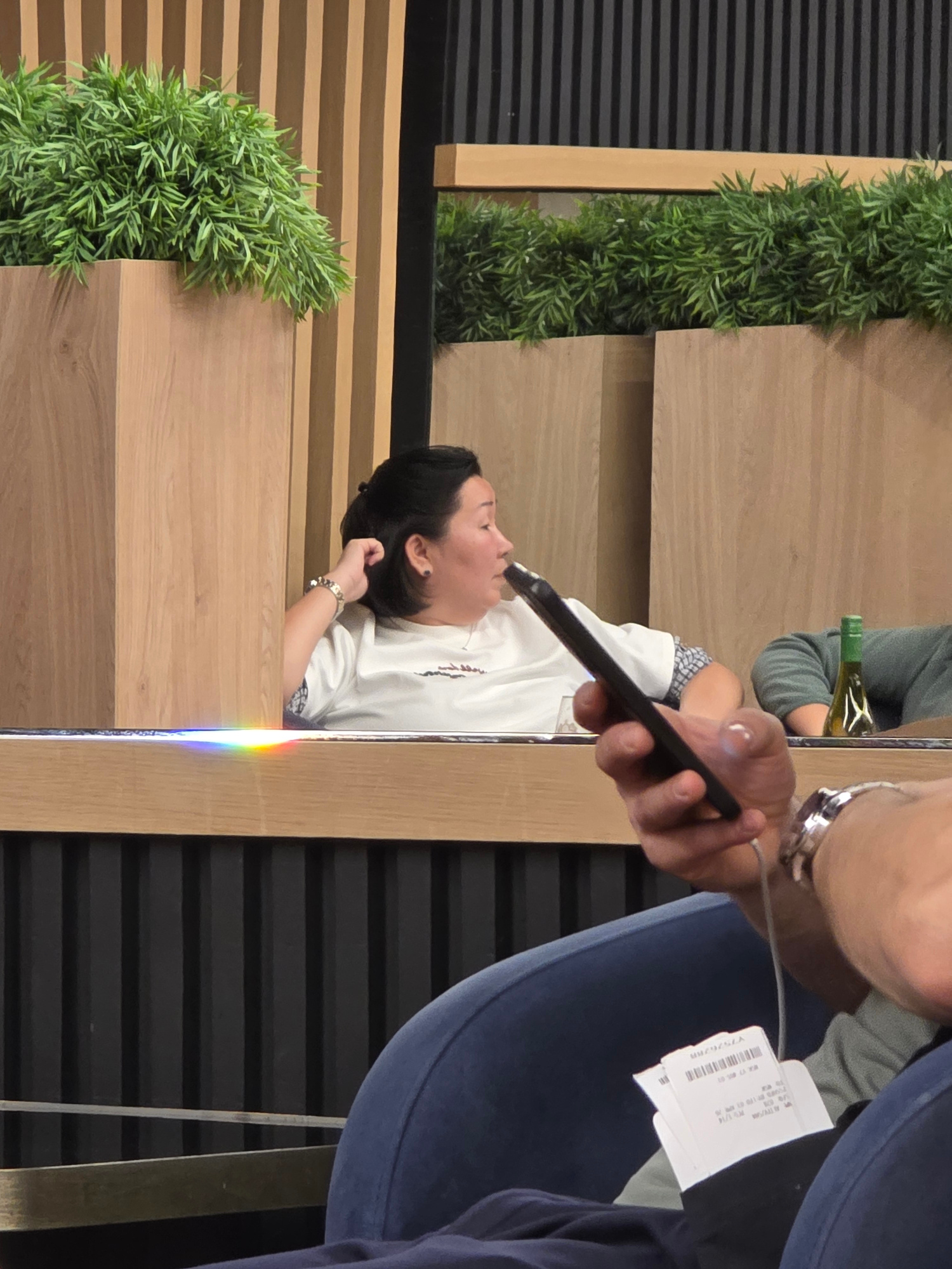 The scene appears to be an interior space, possibly a restaurant or hotel, featuring wooden-paneled walls interspersed with vertical sections of greenery, suggestive of an indoor garden or decorative…read more
