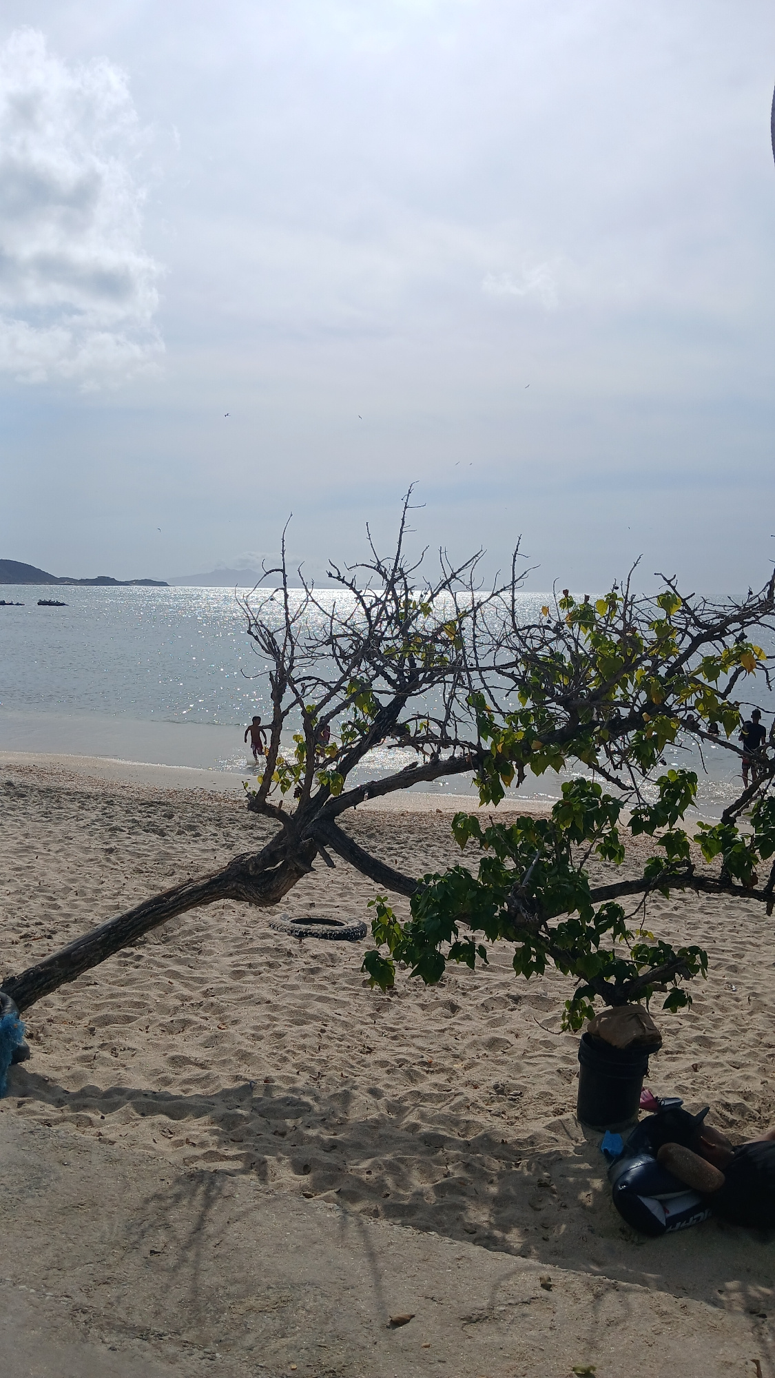 On a beach in Juan Griego, Venezuela, a leaning tree with green leaves and bare branches dominates the scene. The ocean with shimmering water stretches into the background. A person is seen hanging fr…read more