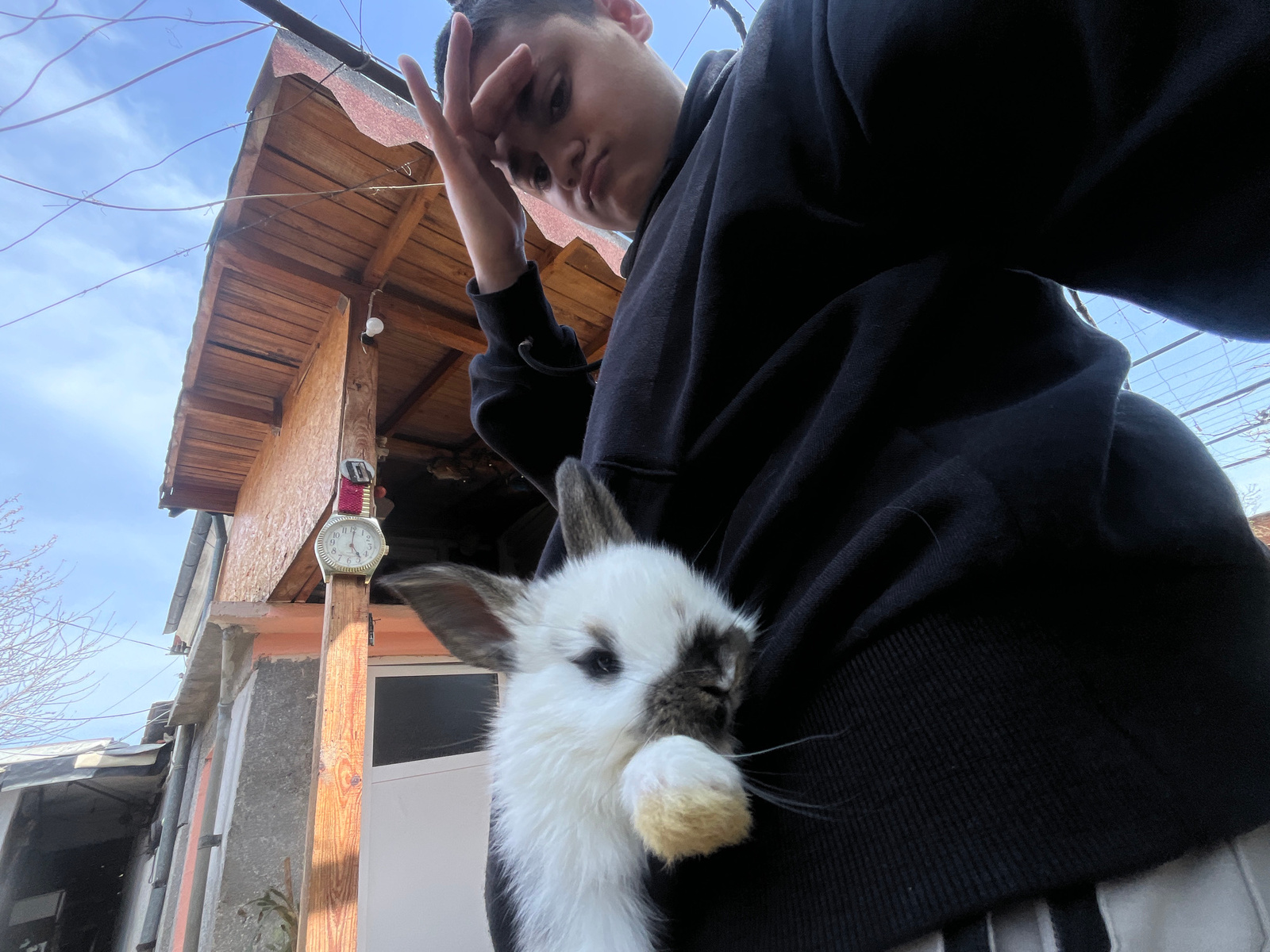 A low-angle selfie shows a person holding a white rabbit in front of them. The person has dark hair and is wearing a dark hooded sweatshirt. The rabbit is mostly white with some darker markings around…read more
