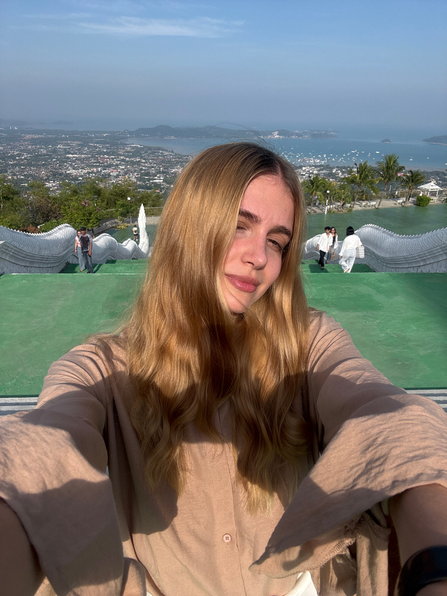 A young woman is taking a selfie at the Karon Viewpoint in Karon, Thailand. The view overlooks the city, bay, and coastline. In the background, there are white dragon sculptures on a green surface. Se…read more