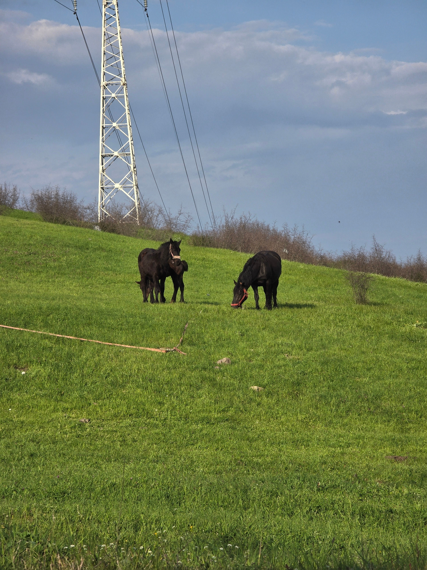 The image, taken in Burgas, Bulgaria, presents a dynamic outdoor scene featuring two black bovine animals grazing on a vibrant green, sloping grassy field. The perspective is tilted, making the horizoβ¦read more