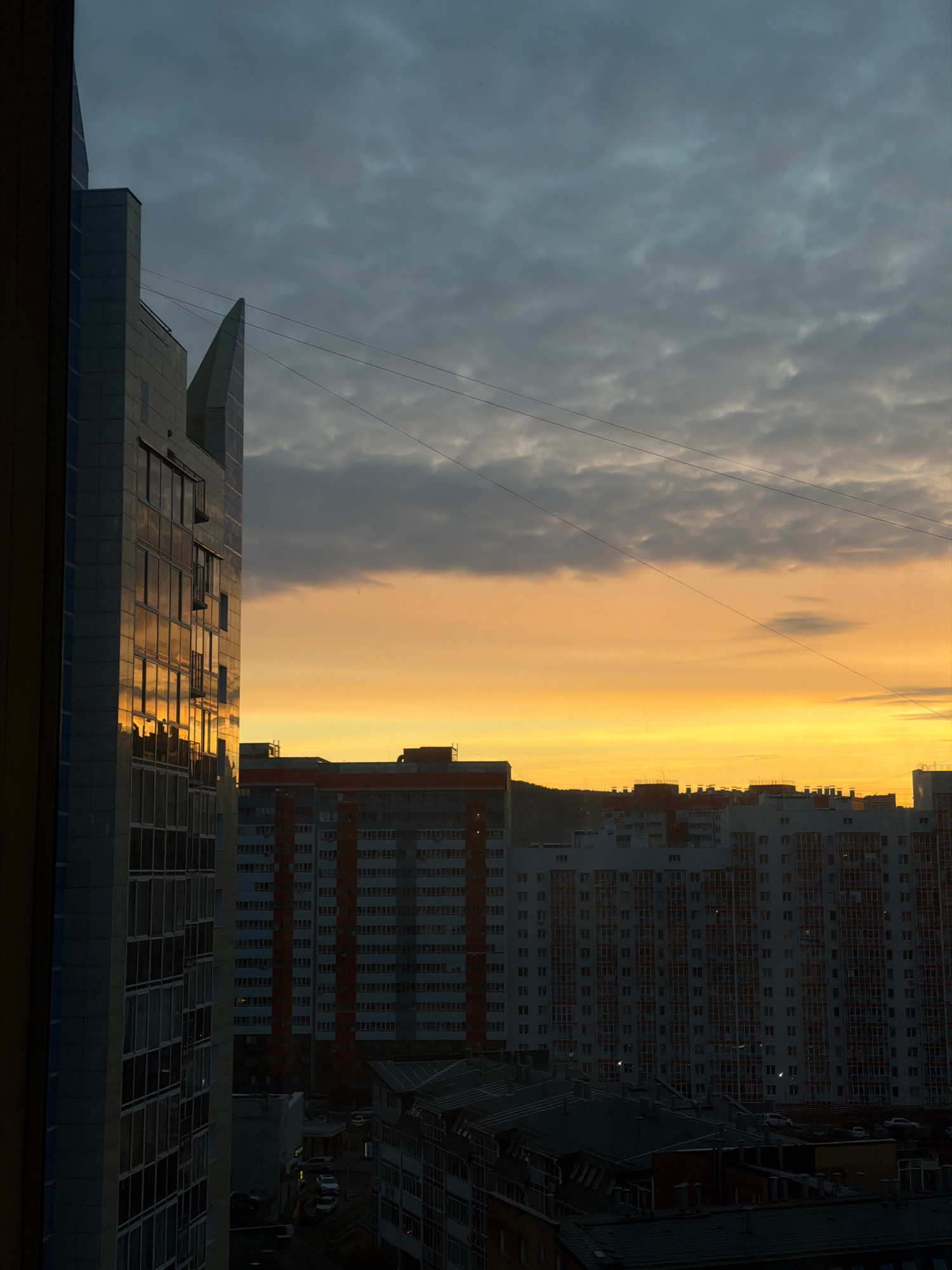 The image captures a cityscape at dawn or dusk in Krasnoyarsk, Russia. The view is from an elevated position, likely an apartment or office building, overlooking a cluster of buildings. The sky transi…read more